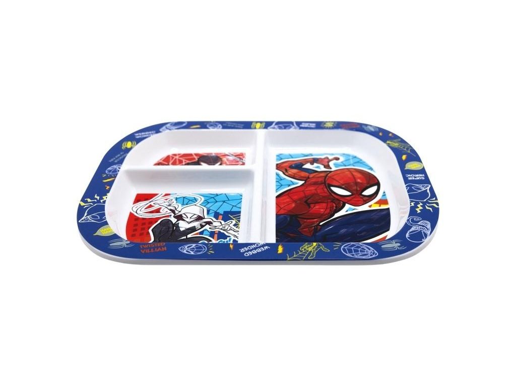 Dělený plastový talíř s motivem Spiderman. Rozměry: 22 x 19,5 x 1,8 cm. Hmotnost: 88 gr. Materiál: plast vhodné do mikrovlnné trouby Vhodné pro děti od 4 let. Výrobce: Stor.