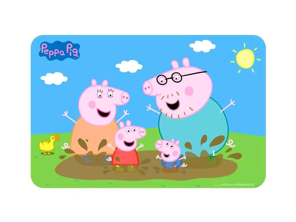Podložka na stůl s motivem Peppa pig - family. Rozměry: 43 x 28 cm. Materiál: 100% PVC. Slouží jako jídelní podložka nebo ochrana stolu při psaní, malování či hraní. Chrání povrch stolu před poškrábáním, nečistotami a skvrnami. Je vyrobena z lehce omyvatelného plastu, konkrétně 100% PVC. Rozměry se pohybují kolem 43 x 28,5 cm. Je vhodná pro děti od 3 let.