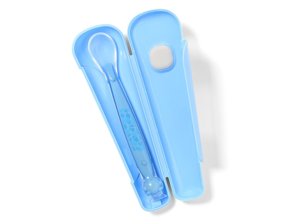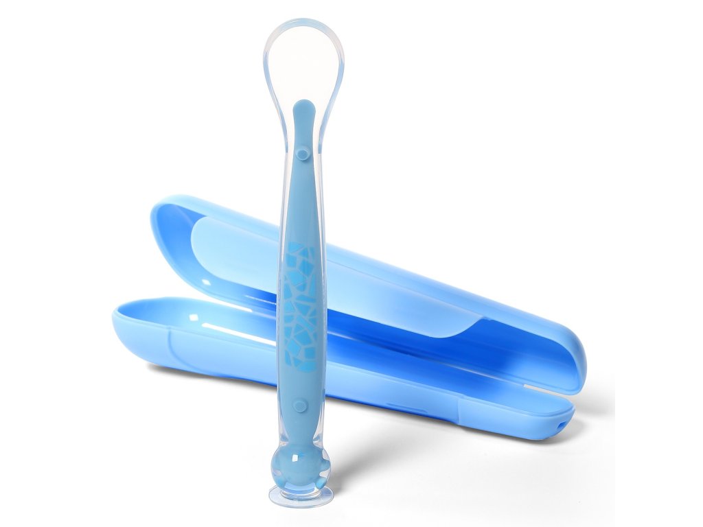 Silikonová lžička úzká s přísavkou v pouzdře - modrá