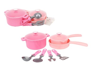 Sada nádobí s doplňky plast růžová v síťce 20x30x10cm 18m+