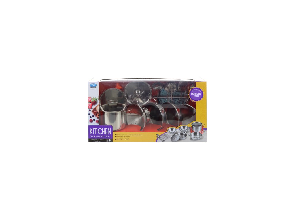 Nerezová sada nádobí obsahuje hrnec, cedník, pánvičku, misku, nízký hrnec, 2 pokličky, naběračku na polévku, obracečku, ruční malý cedník a naběračku na těstoviny. Baleno v krabici. Rozměry balení cca 38x20x10 cm. Věk 3+Doplňkové parametry