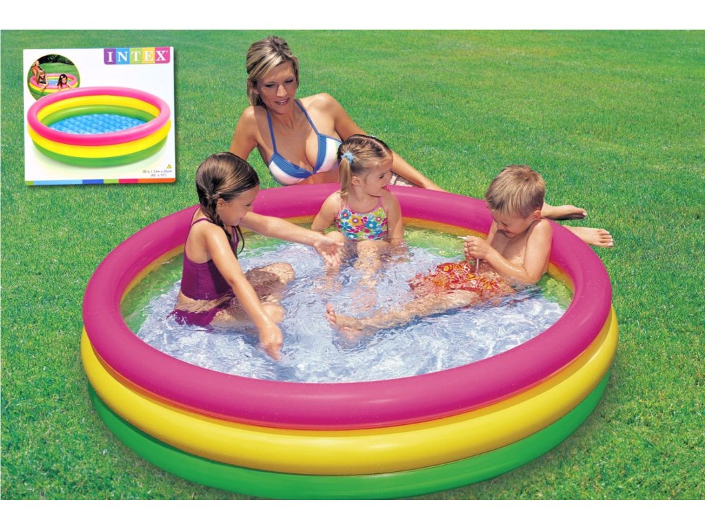 Dětský bazének je složený ze tří prstenců, každý z nich se nafukuje samostatně. Podlaha z měkčeného PVC zabraňuje odření a současně působí protiskluzově. Bazén lze umístit kdekoliv, kde bude nejmenším plavcům vyhovovat. Pod bazén je vhodné dokoupit ochranou podložku. Parametry bazénu: průměr: 1,14 m; výška: 0,25 m; objem: 131 l; váha balení: 1,16 kg. Obsah balení: bazén, sada na opravu.Vhodné pro děti od 2 let.