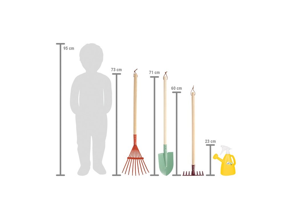Rozměry: rýč cca 12x2,5x71 cm, hrábě cca 15x6,5x60 cm, hrábě na listí cca 20x2,5x73 cm, konvička 2v1 18x9,5x23 cm