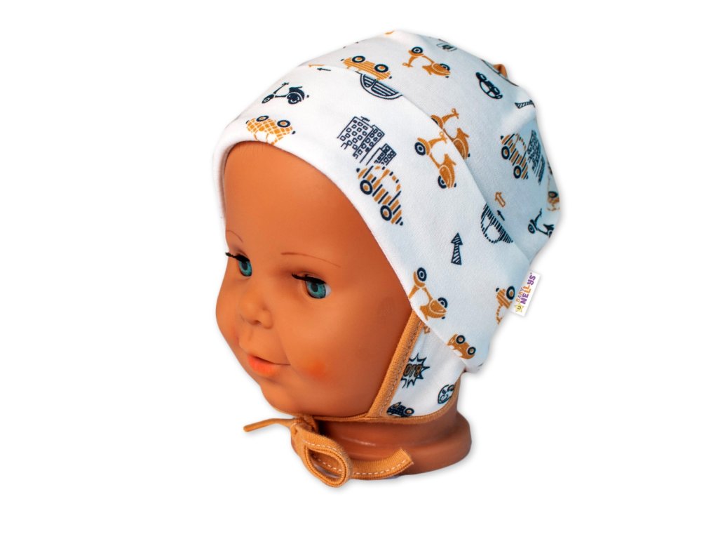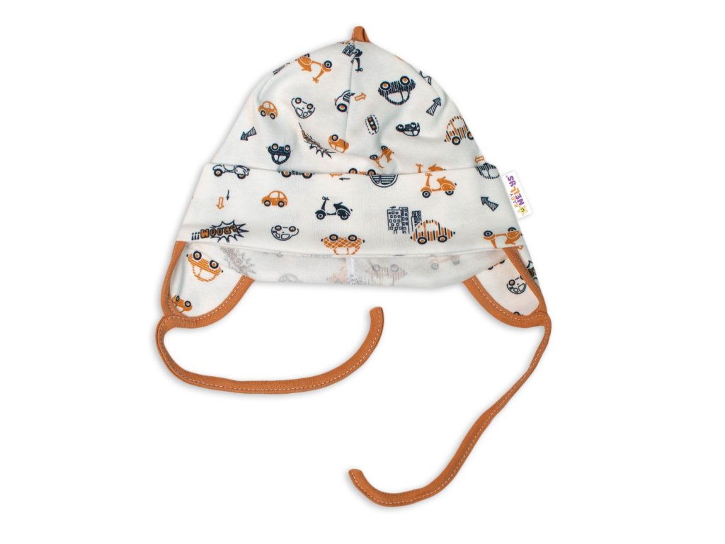 Baby Nellys Bavlněná čepička s oušky na zavazování- Car, smetanová/hnědá