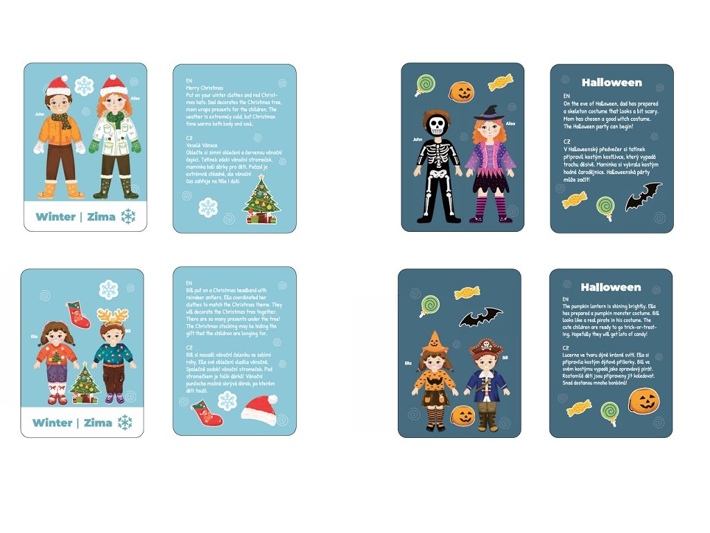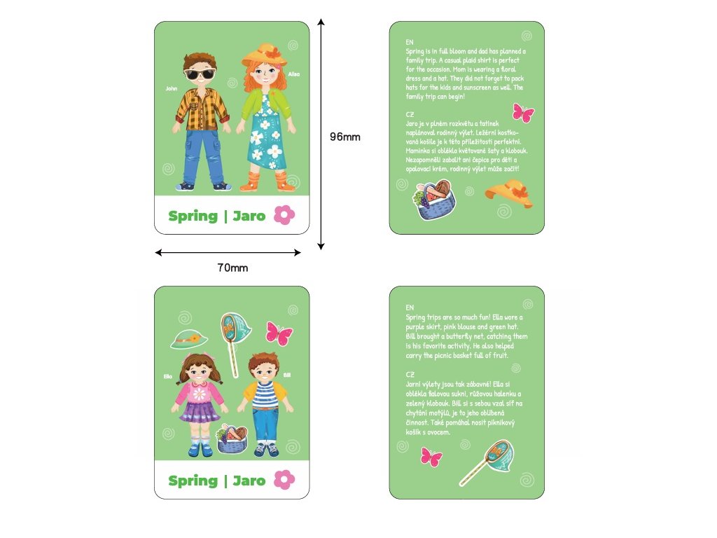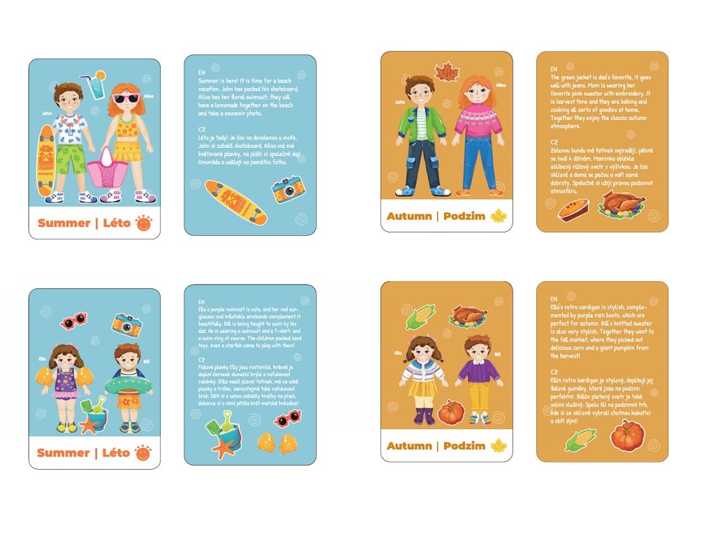 - 8 oboustranných kartiček s příběhy v češtině a angličtině (jaro, léto atd.)