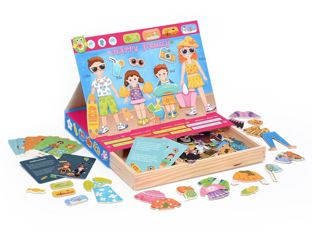 Oblékněte celou rodinu podle ročního období, nálady nebo zábavného úkolu! Magnetická sada „Happy Family“ přináší spoustu kreativní zábavy při navrhování oblečků pro maminku, tatínka, holčičku i chlapečka. Každý člen rodiny má své magnetické oblečky, doplňky a jedinečný styl – a záleží jen na dětské fantazii, jak je oblékne.