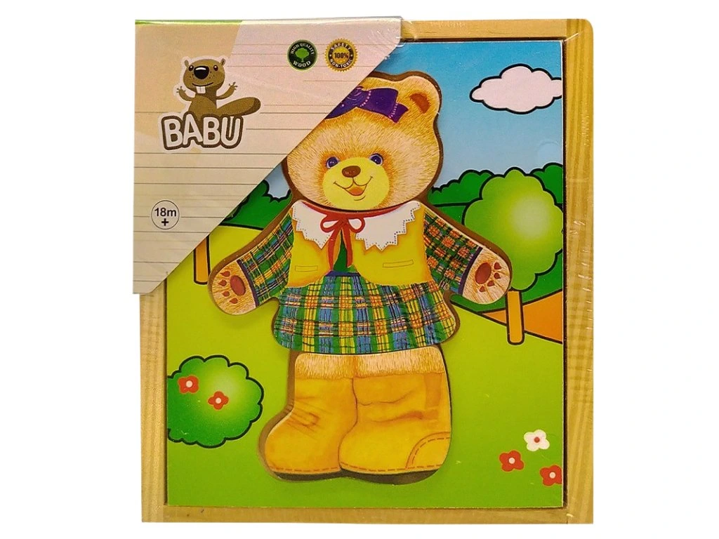 Dřevěné skládačky patří mezi velmi oblíbené hračky pro všechny malé děti. U této skládačky mohou děti libovolně kombinovat dílky oblečení a figurku různě oblékat. Podle toho jak se oblečení figurce, které ji navrhneš, líbí se také tváří a může vyjádřit svůj názor.. v sadě jsou totiž i výměnné hlavičky.. Tato vkládačka je vhodná pro nejmenší děti. Skládačka je vyrobená ze dřeva, má milý motiv. Z kolekce dřevěné hračky od kvalitní značky BABU. - Rozměr hračky: 13x14x4cm - Věk 18 m+Doplňkové parametry
