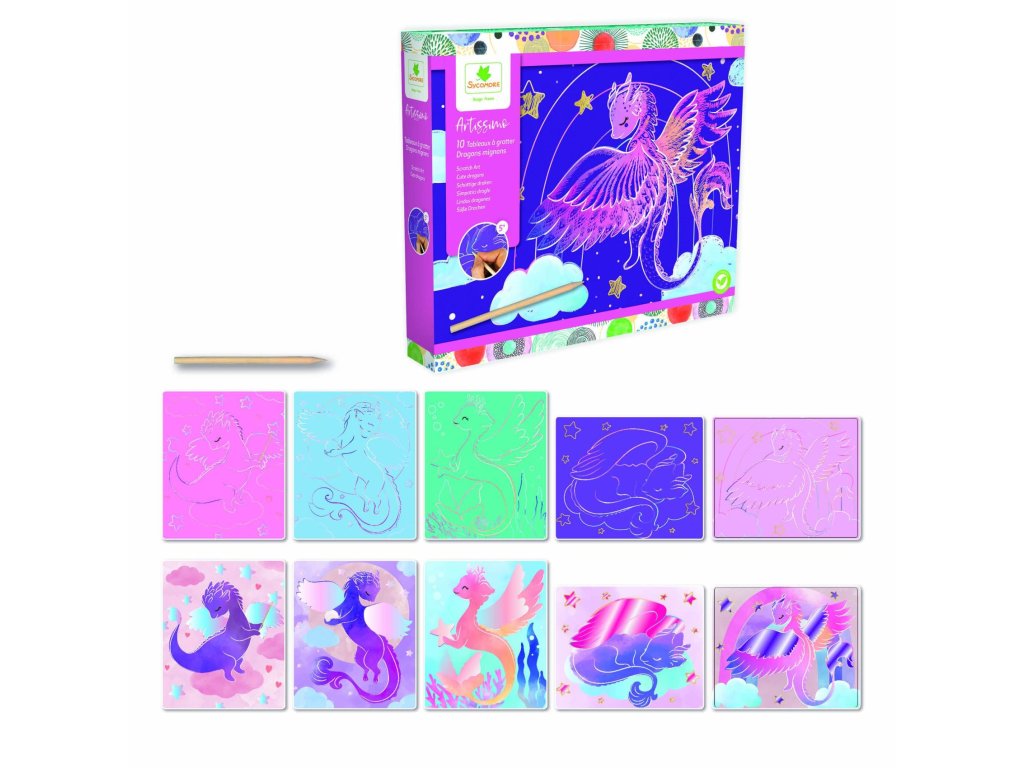 Škrabací obrázky s motivy dráčků v krásném barevném provedení, zavedou děti do pohádkového světa fantazie. Balení obsahuje: 10 kusů škrabacích obrázků, dřevěné škrabátko ve tvaru tužky s hrotem a barevný návod. Baleno v luxusní pevné krabičce se zavíráním na magnet, která poslouží jako skvělý úložný box. Doporučeno pro děti od 5 let. Velikost balení: 26 x 22 x 4 cm.Doplňkové parametry