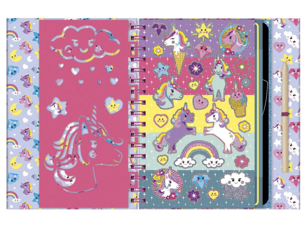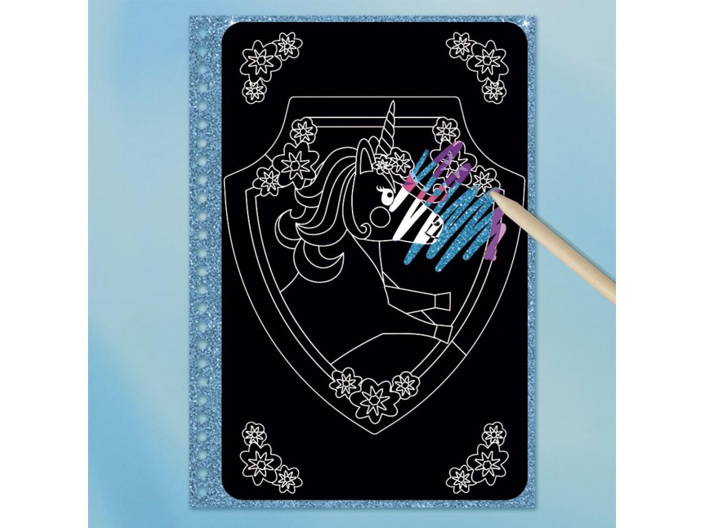 Škrabací obrázky v tvrdých deskách a ve spirálovém vázání k pohodlnému otáčení s motivy Jednorožce. Skvělé na cestování, ať už letadlem, vlakem nebo autem! Stačí seškrábat a objeví se barevný obrázek. Obsahuje:10 škrabacích obrázků, tužku se špičkou na vyškrabávání, šablony na obkreslení a samolepky.Rozměry výrobku 20 x 24 x 1,5 cm.