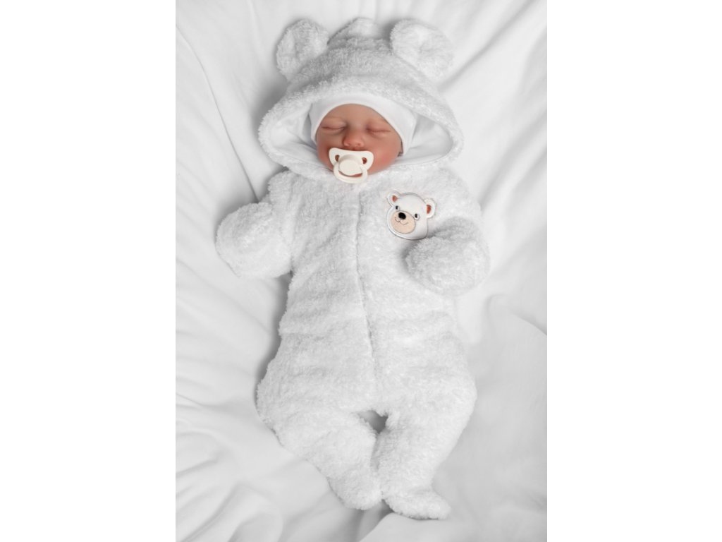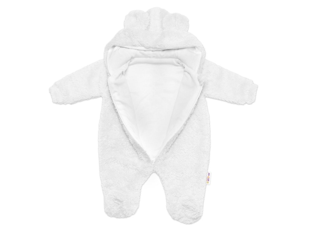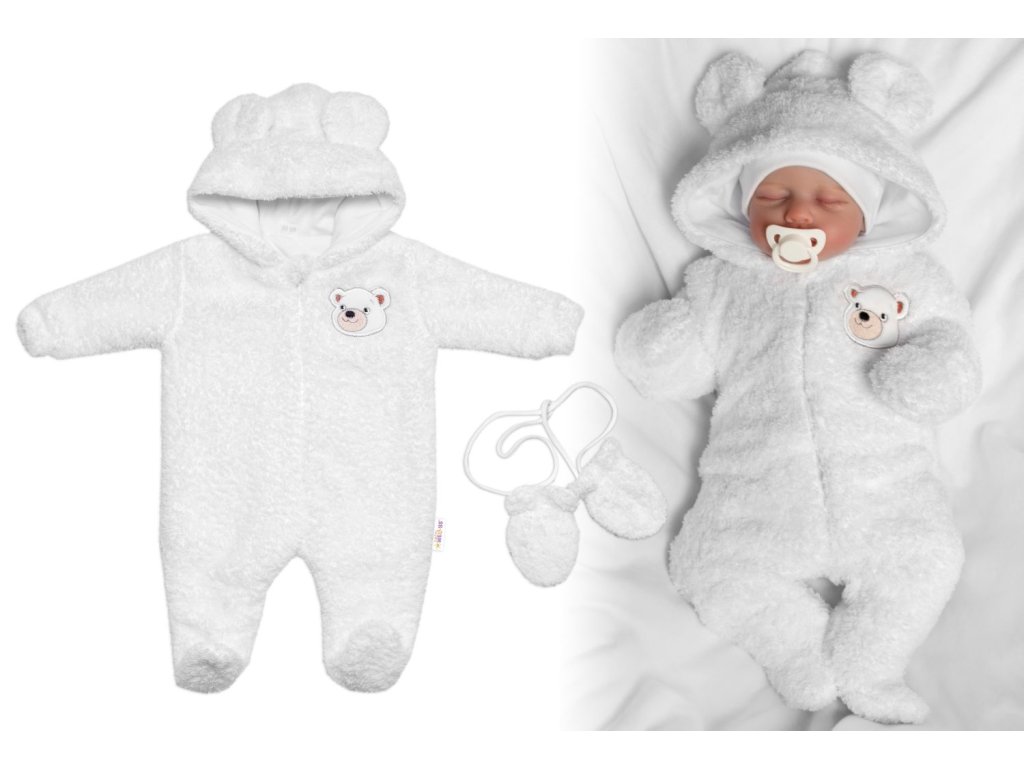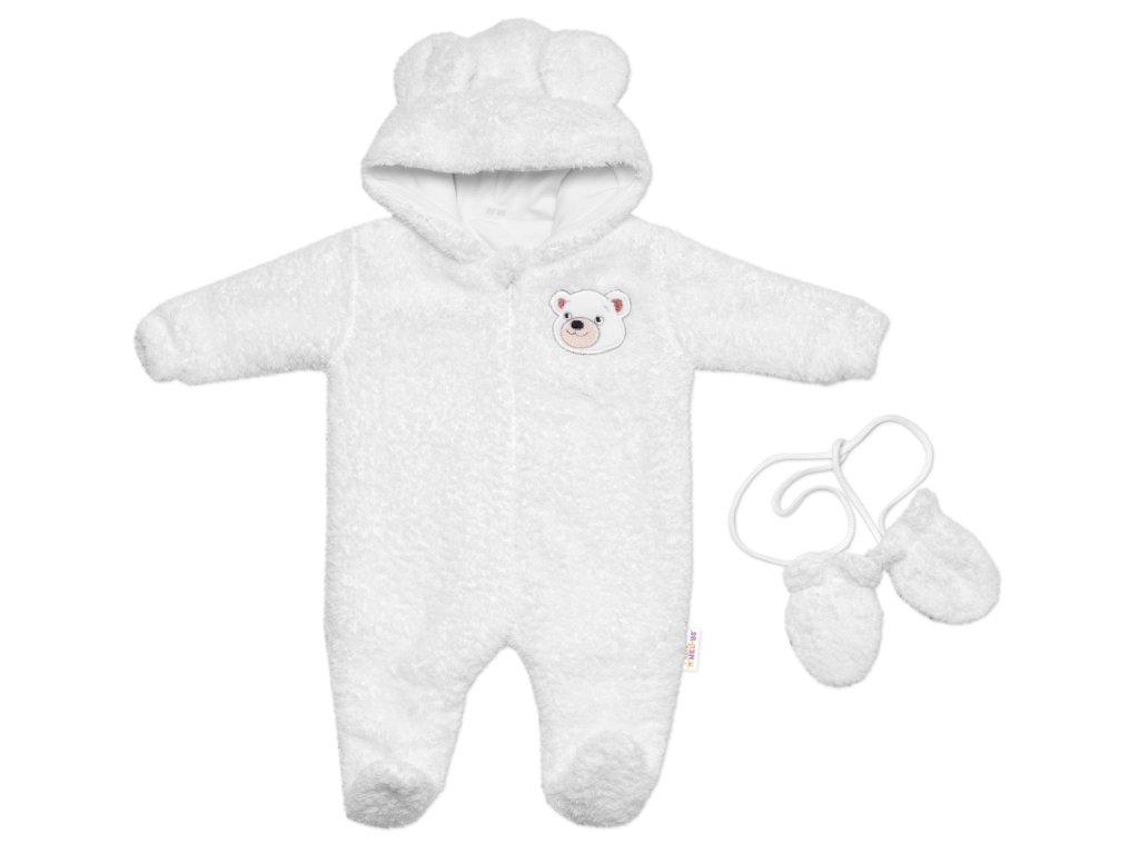 Chlupáčkový overal Luna s kapucí + rukavičky, Baby Nellys, Medvídek, bílý