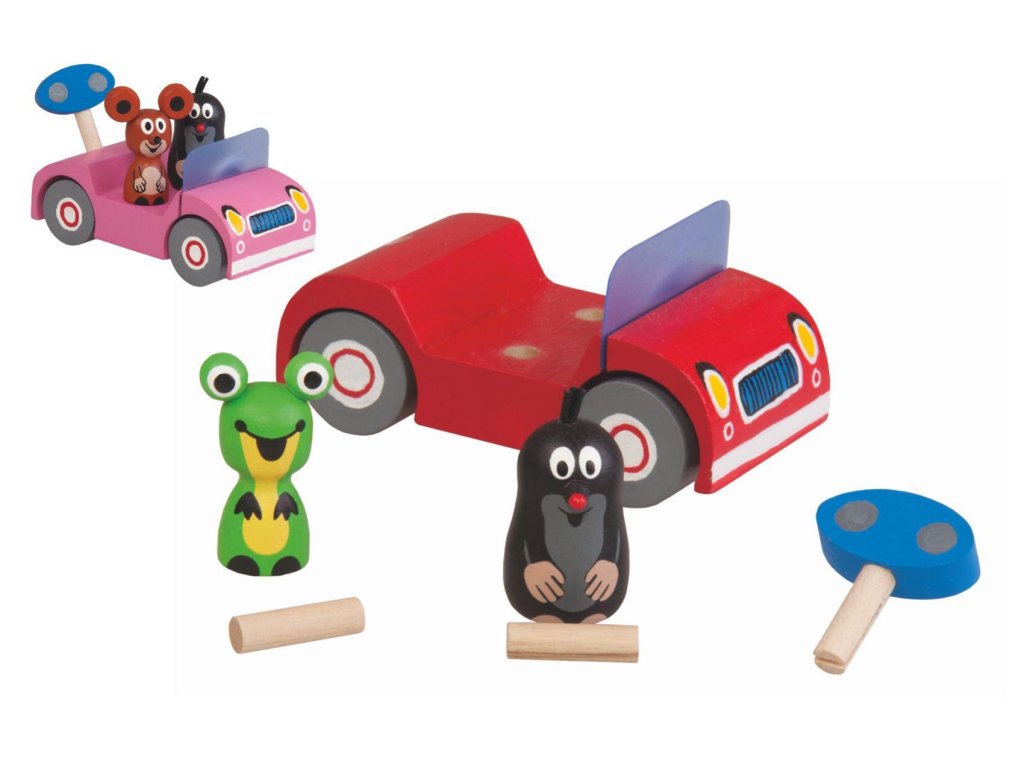 Krteček s kamarádkou Žabkou se vydali na výlet v červeném autíčku.