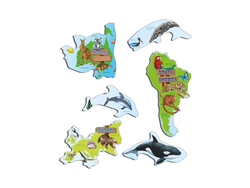Kde žije panda? A odkud pochází tučňák? S tímto krásně ilustrovaným puzzle se děti vydají na cestu kolem světa za poznáním zvířecí říše. Každý kontinent je barevně odlišen a osídlen typickými zvířaty, takže si malí objevitelé snadno spojí zvíře s místem, kde žije. Puzzle podporuje zeměpisné a přírodovědné znalosti, rozvíjí zrakové vnímání i logické myšlení. Díky hravému motivu se stane oblíbenou pomůckou doma i ve školce či škole. Pevná konstrukce, kvalitní a odolné dílky zajistí pohodlné skládání a dlouhou životnost.