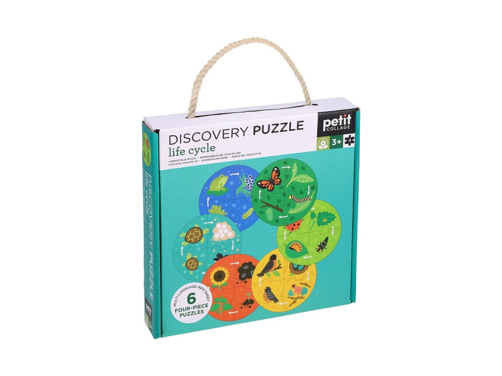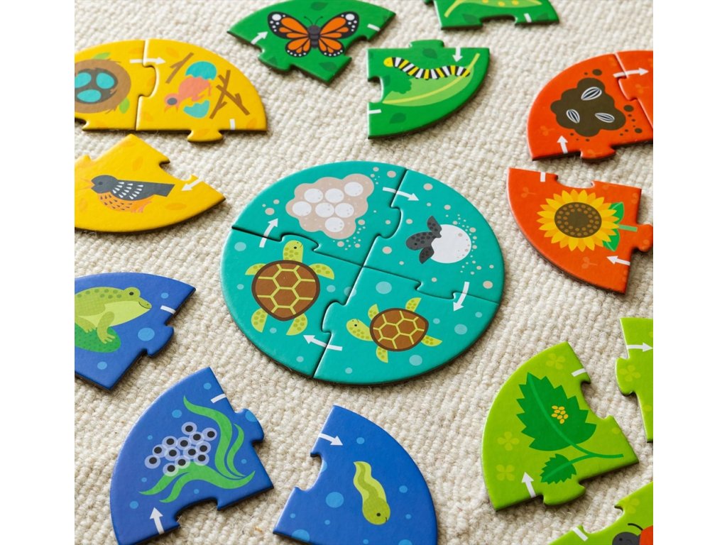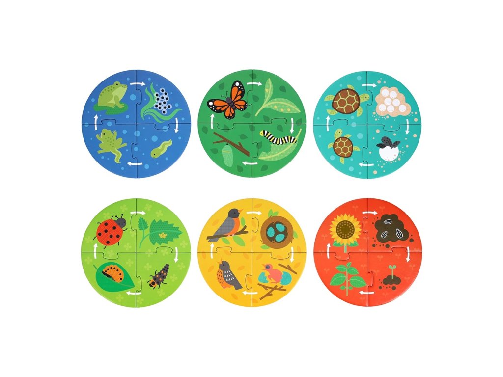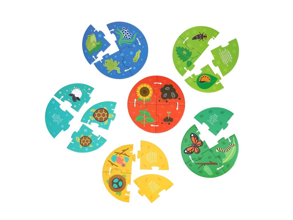 Probuďte zájem Vašeho dítěte o svět přírody a prozkoumejte pomocí šesti malých puzzle životní fáze berušky, motýla, želvy, žáby, květiny a ptáka! Skládání puzzle zlepšuje koordinaci ruka-oko, podporuje kognitivní vývoj a schopnost řešit problémy. Odolné pevné dílky jsou velikostí vhodné pro malé dětské ručičky. Puzzle je vyrobeno z papíru s certifikací FSC® a potištěno rostlinnými barvami. obal je vyroben ze 75 % recyklovaných materiálů. Zabaleno v pevné krabičce s uchem z organické bavlny pro snadné skladování a převážení.