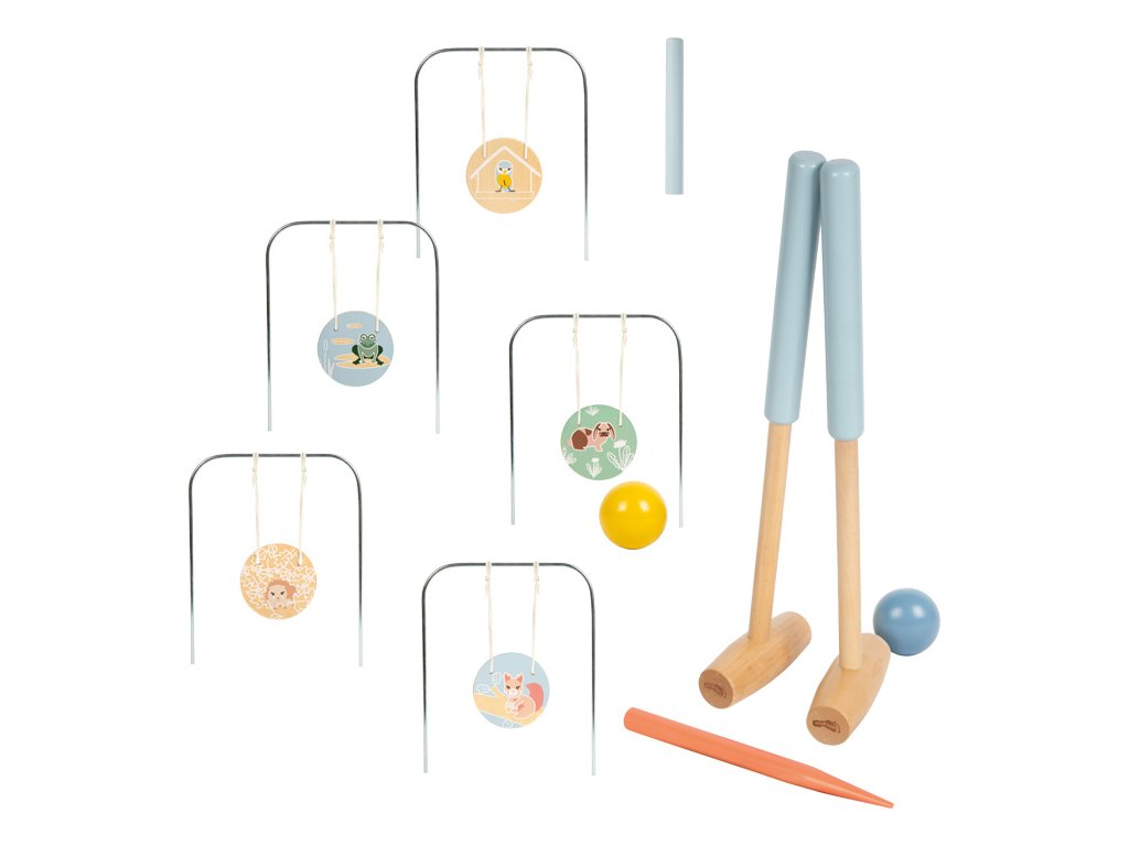 - 2 kroketové paličky, 2 koule, 2 kolíky, 5 branek, 5 závěsných koleček se zvířátky