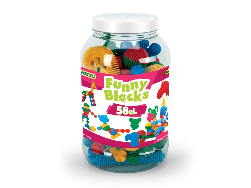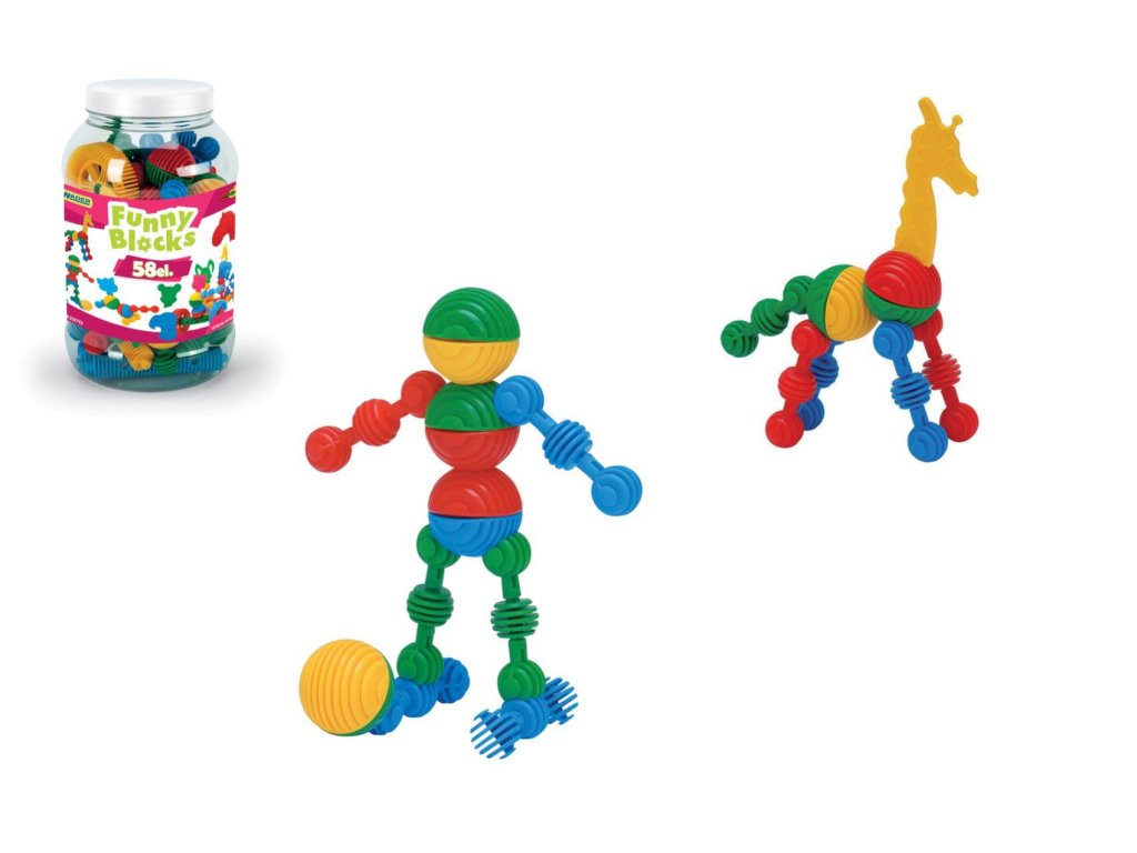 Sada kostek Funny blocks zabaví každé dítko. V balení jsou kostky ve tvaru zvířecích hlav, jako jsou žirafa, pes, kotě, kůň, opička, papoušek, zajíc a slon, které v kombinaci s dalšími kostkami dokonale skládají do podoby vybraného zvířátka a dalších předmětů.V balení je 58 ks.