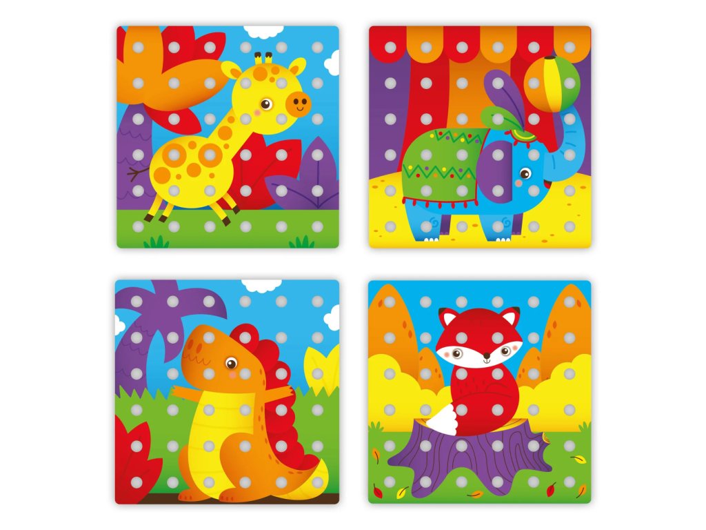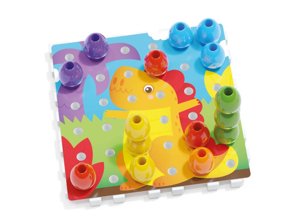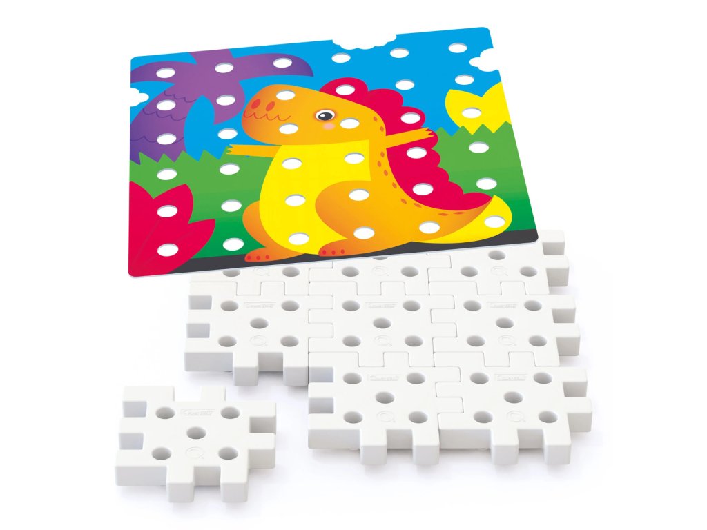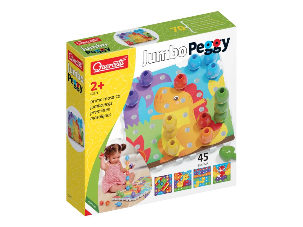 Dokážeš vložit velké barevné kolíčky na správná místa? Mozaiková sada Jumbo Peggy umožňuje vstup do světa kolíčkových her dětem již od 2 roku. Lze tvořit podle předlohy nebo můžete obrázky odložit stranou a podložka s kolíčky se rázem promění v originální stavebnici (souprava tak vlastně přináší dvě hry). V malých rukách se velké kolíčky skvěle drží.