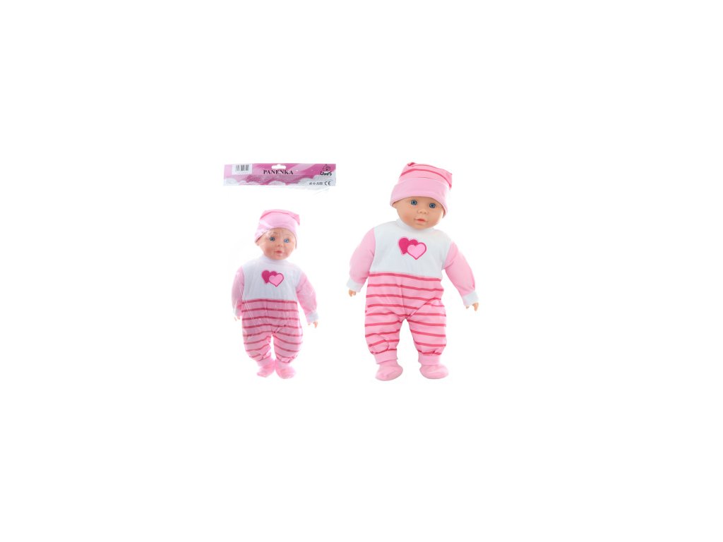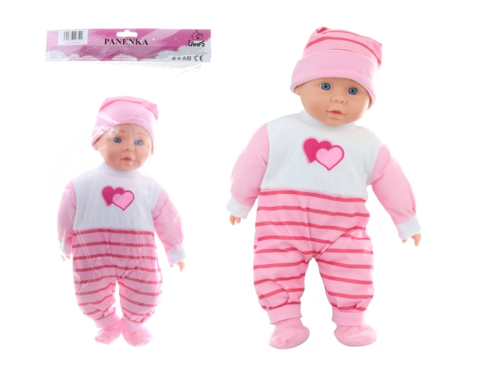 Miminko s měkkým tělíčkem. Miminko je oblečeno do barevného pyžámka, které lze sundat (suchý zip). Po zmáčknutí bříška miminko vydává zvuky. Napájení na 3 AG13 baterie (jsou součástí). Rozměry miminka cca 40 x 17 x 7 cm. Baleno v plastovém sáčku. Věk 3+Doplňkové parametry