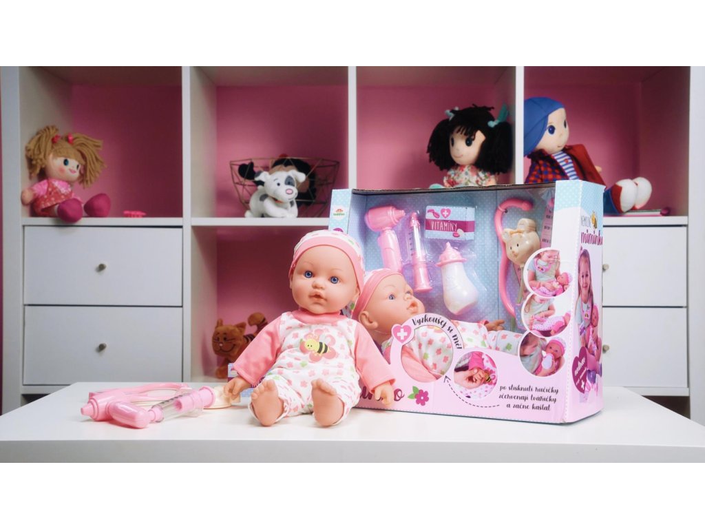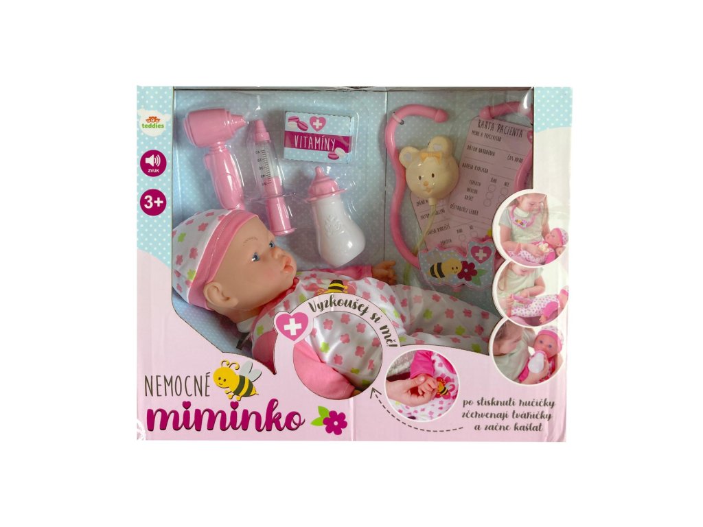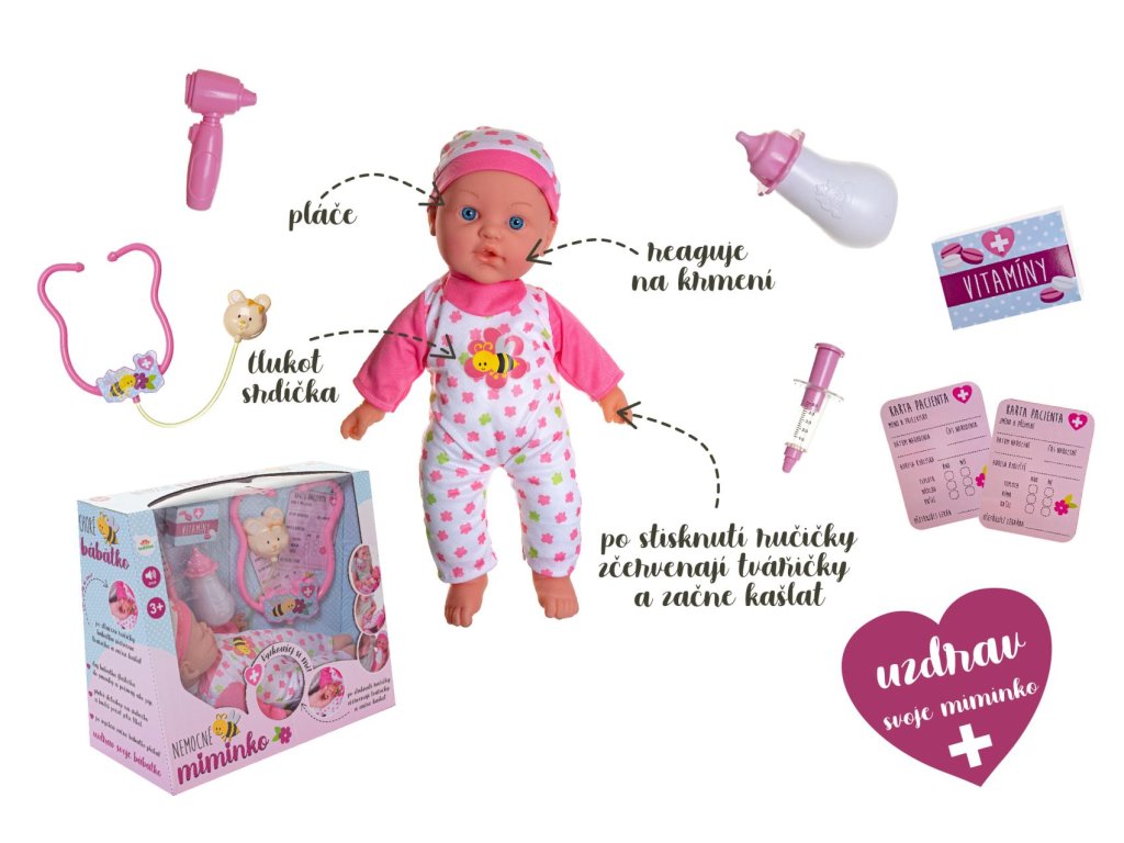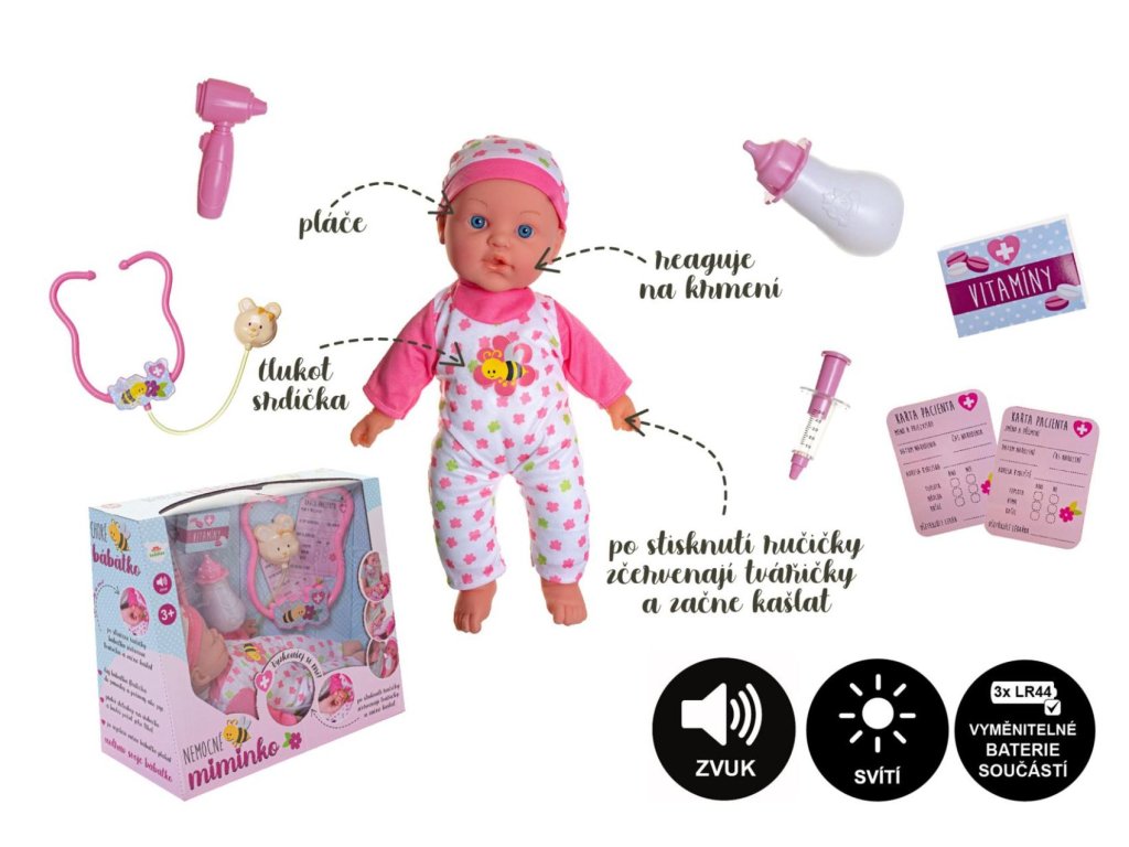 Nemocné miminko, které potřebuje pomoc od malých maminek či budoucích lékařek. K tomu jsou potřeba zdravotnické potřeby, které sada obsahuje.Panenka má měkké tělo a je se zvukem a světlem. Po stisknutí ručičky jí zčervenají tvářičky a začne kašlat. Přilož stetoskop na srdíčko a uslyšíš jeho tlukot. Po injekci začne miminko plakat. Dej miminku lahvičku do pusinky a poslouchej, jak pije. Uzdrav svoje miminko. Balení obsahuje stetoskop, injekční stříkačku, kukátko do uší, lahvičku, krabičku s nápisem VITAMÍNY a kartu pacienta. Panenka je velikosti 36 cm. Baterie 3x AG13 jsou součástí balení a slouží pouze pro předváděcí účely, doporučujeme baterie vyměnit za nové.