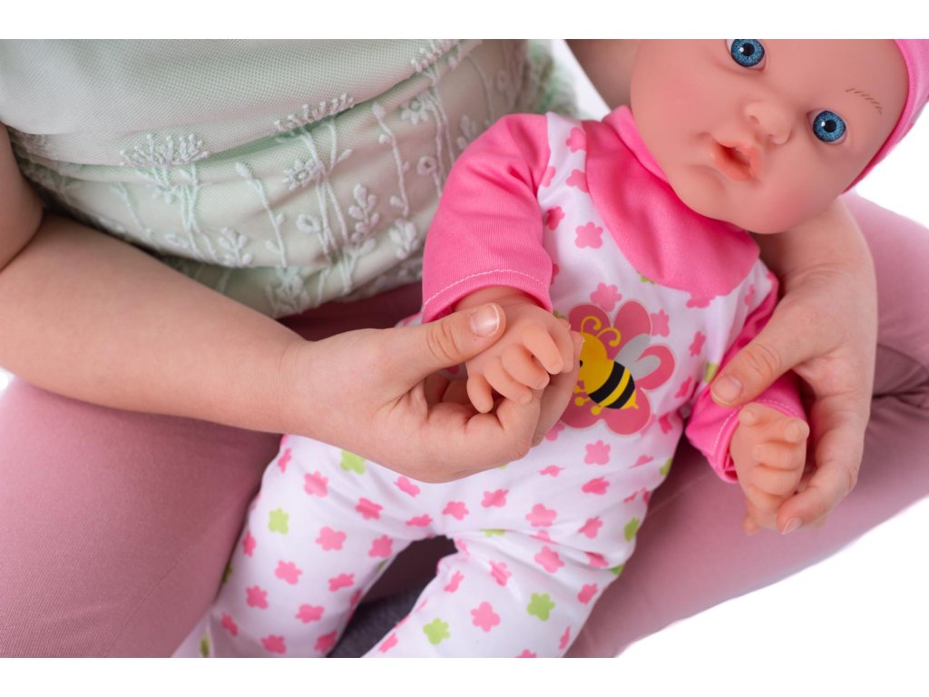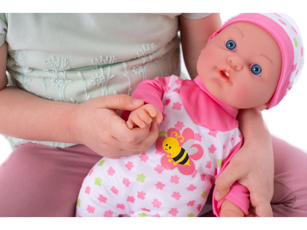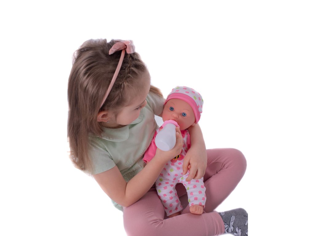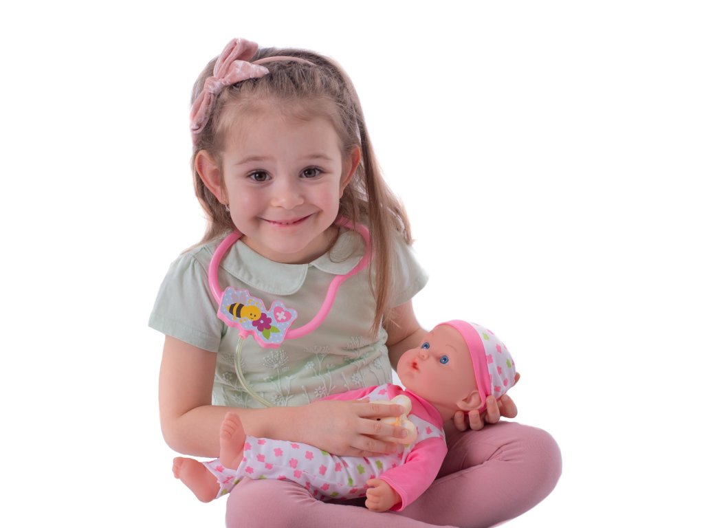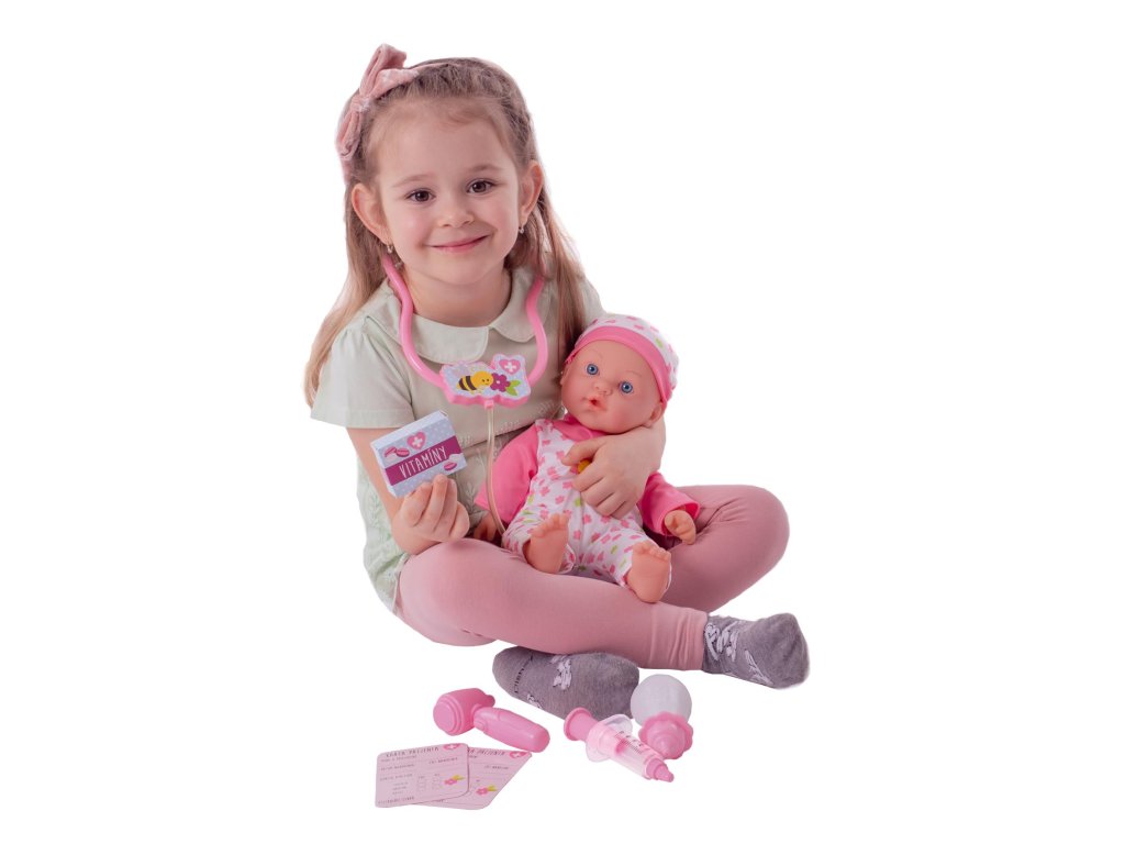Nemocné miminko, které potřebuje pomoc od malých maminek či budoucích lékařek. K tomu jsou potřeba zdravotnické potřeby, které sada obsahuje.Panenka má měkké tělo a je se zvukem a světlem. Po stisknutí ručičky jí zčervenají tvářičky a začne kašlat. Přilož stetoskop na srdíčko a uslyšíš jeho tlukot. Po injekci začne miminko plakat. Dej miminku lahvičku do pusinky a poslouchej, jak pije. Uzdrav svoje miminko. Balení obsahuje stetoskop, injekční stříkačku, kukátko do uší, lahvičku, krabičku s nápisem VITAMÍNY a kartu pacienta. Panenka je velikosti 36 cm. Baterie 3x AG13 jsou součástí balení a slouží pouze pro předváděcí účely, doporučujeme baterie vyměnit za nové.