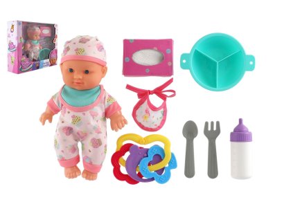 Panenka miminko 22cm pevné tělo plast s doplňky v krabici 30x24x8cm