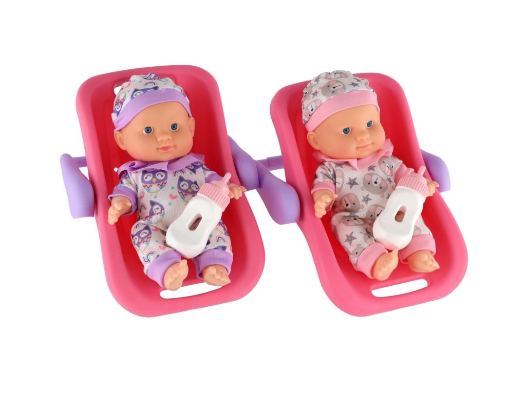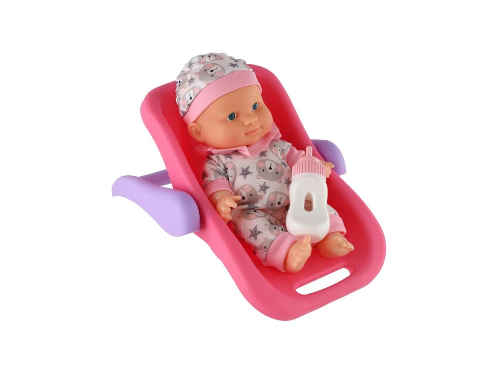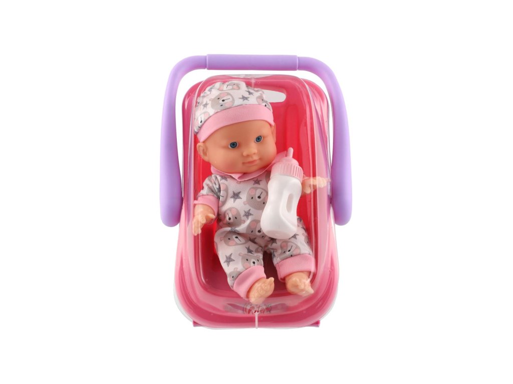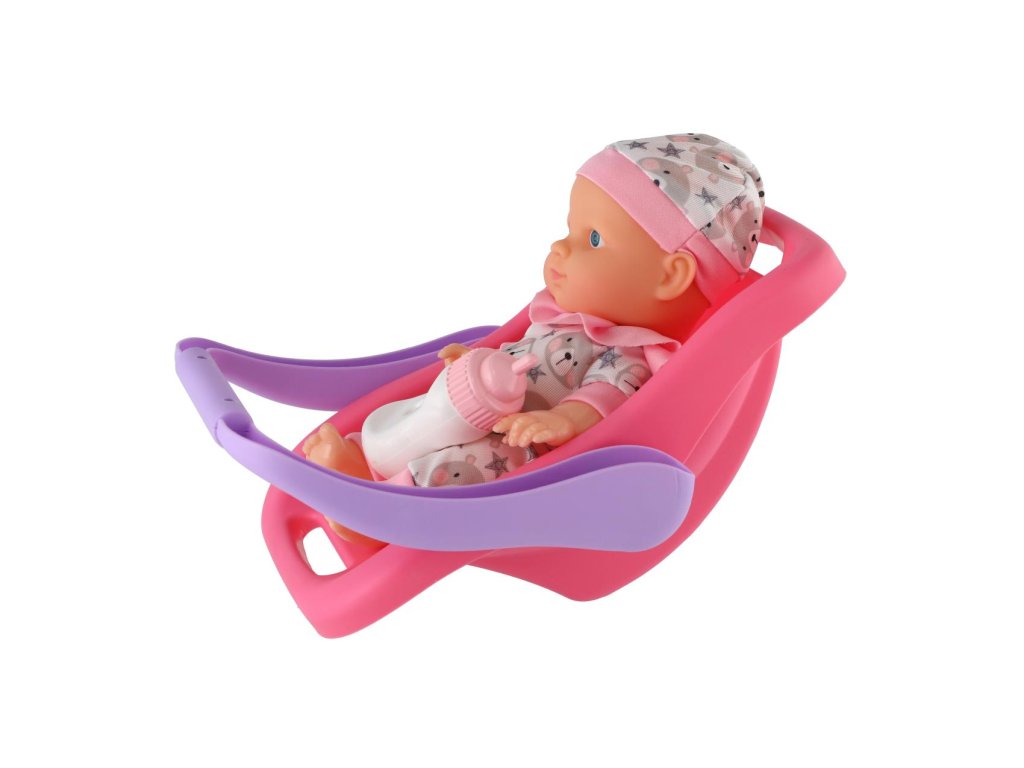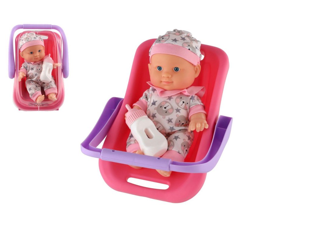 Panenka miminko plast 22 cm pevné tělo v nosítku/autosedačce s lahvičkou 2 barvy (1 ks)