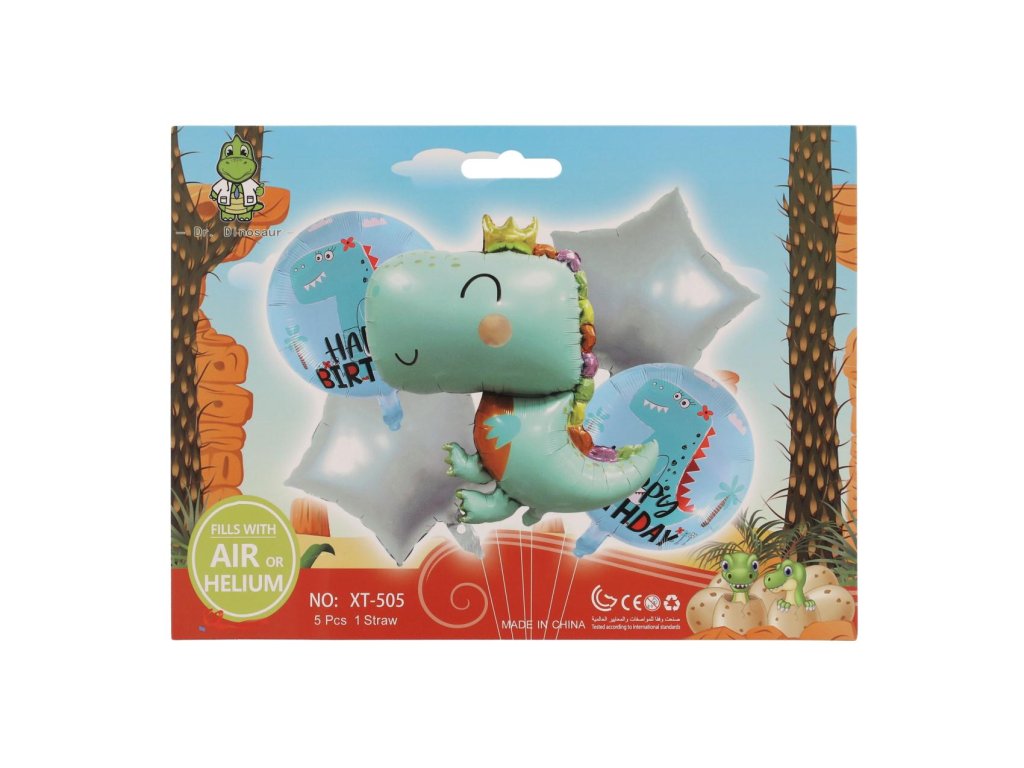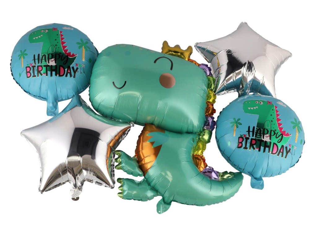 Veselá nafukovací sada balonků s motivem dinosaura potěší každého malého oslavence!Uvnitř balení najdete 5 kusů balonků v různých tvarech – včetně roztomilého dinosaura s korunkou, kulatých balonků s nápisem „Happy Birthday“ a dvou hvězd.