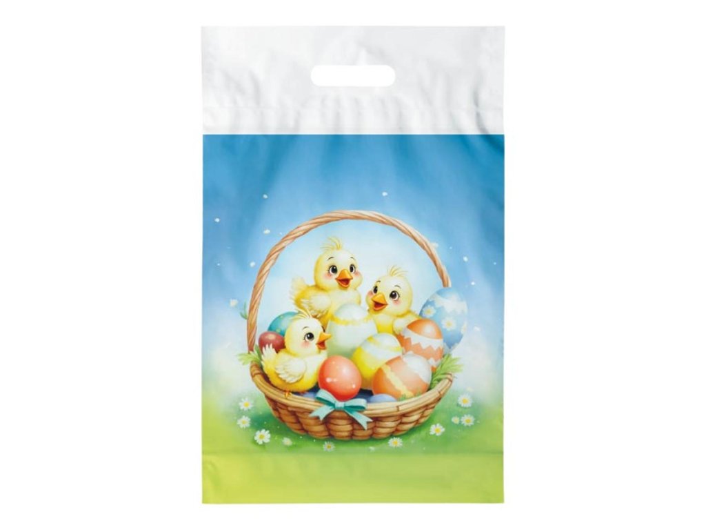 Velikonoční igelitová taška ve velikosti L s jarním motivem je ideální pro balení dárků, pomlázek nebo dekorací. Praktické plastové ucho umožňuje pohodlné nošení. Veselý potisk vynikne při každé velikonoční nadílce.Vyrobeno z lehkého, ale pevného materiálu vhodného pro opakované použití.