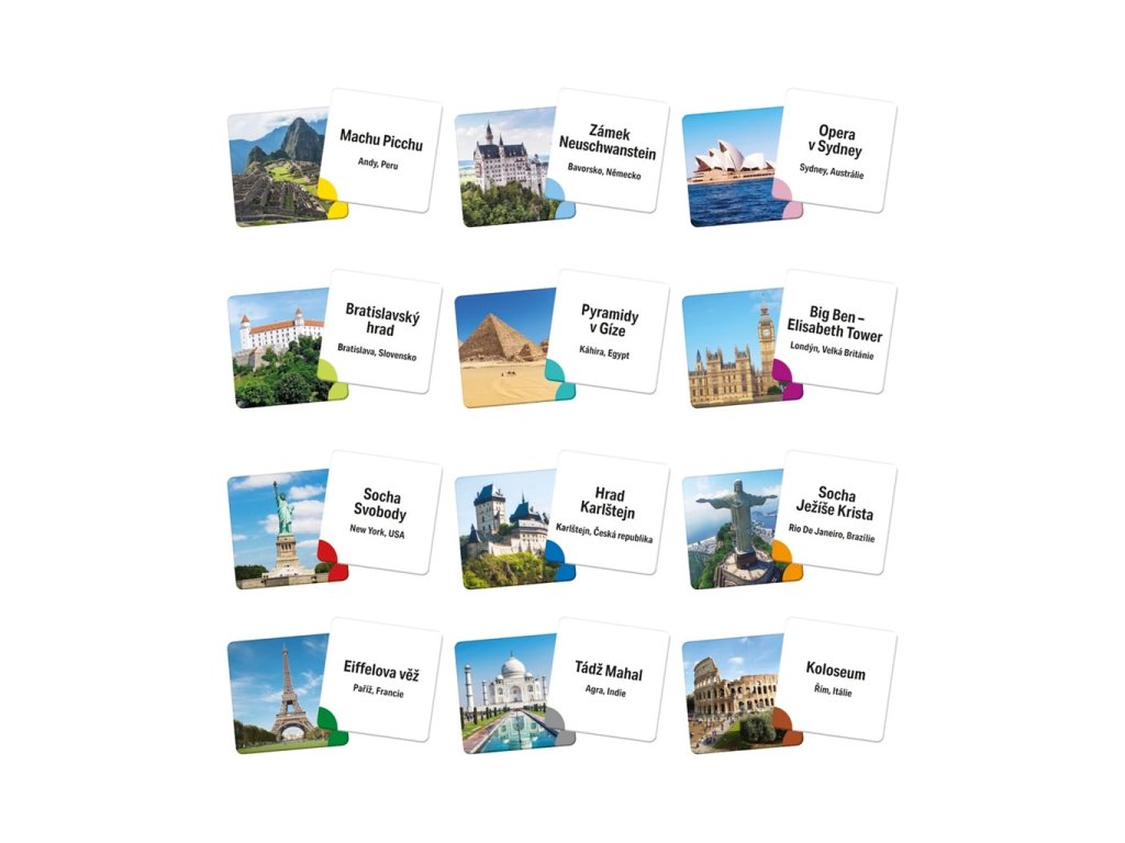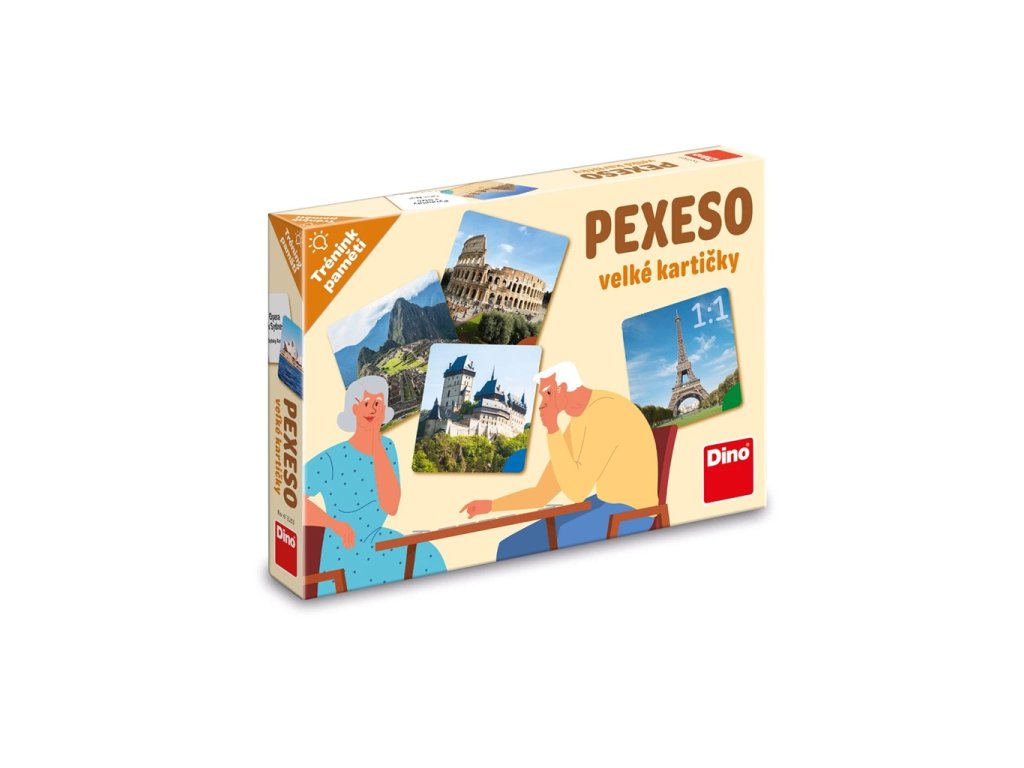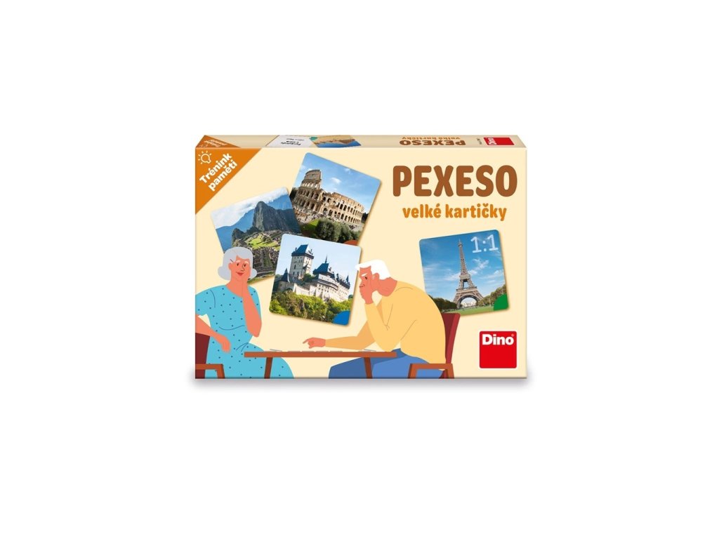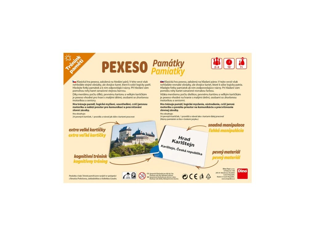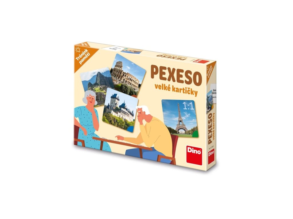 Klasická hra založená na hledání párů. V této verzi však nehledáte stejné obrázky, ale fotografie významných míst a a odpovídající názvy. Při hledání Vám pomohou rohy karet označené stejnou barvou. Díky menšímu počtu kartiček, pevnému kartonu a velkým kartičkám je pexeso vhodné pro hraní s malými dětmi a také s osobami se zhoršenou motorikou a seniory.