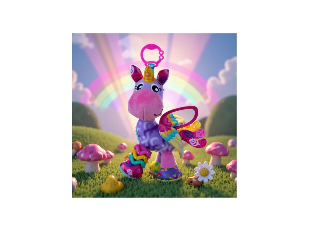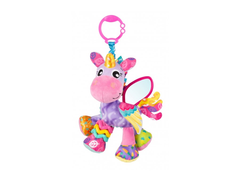 Playgro – Jednorožec Stella je kouzelná hračka pro miminka, která podporuje rozvoj smyslů a nabízí spoustu podnětů k objevování. Má měkkou hlavičku a zrcátko na křídle, které podporuje sebeobjevování. Lesklý roh, stříbrné křídlo a vrstvený ocas lákají k prozkoumávání. Chrastící nožka, šustící ouška a nožičky, cinkající kroužky a hebké látky stimulují zrak, hmat a sluch. Měkké žebrované bříško a kontrastní vzory rozvíjejí hmatové a vizuální vnímání. Díky „C“ klipu lze Stellu snadno připnout na kočárek, autosedačku nebo postýlku, takže je vždy nablízku. Hračka je bezpečná, kvalitní a vhodná od narození. Stella je magická kamarádka, která zabaví, uklidní a pomáhá dítěti objevovat svět.Doplňkové parametry