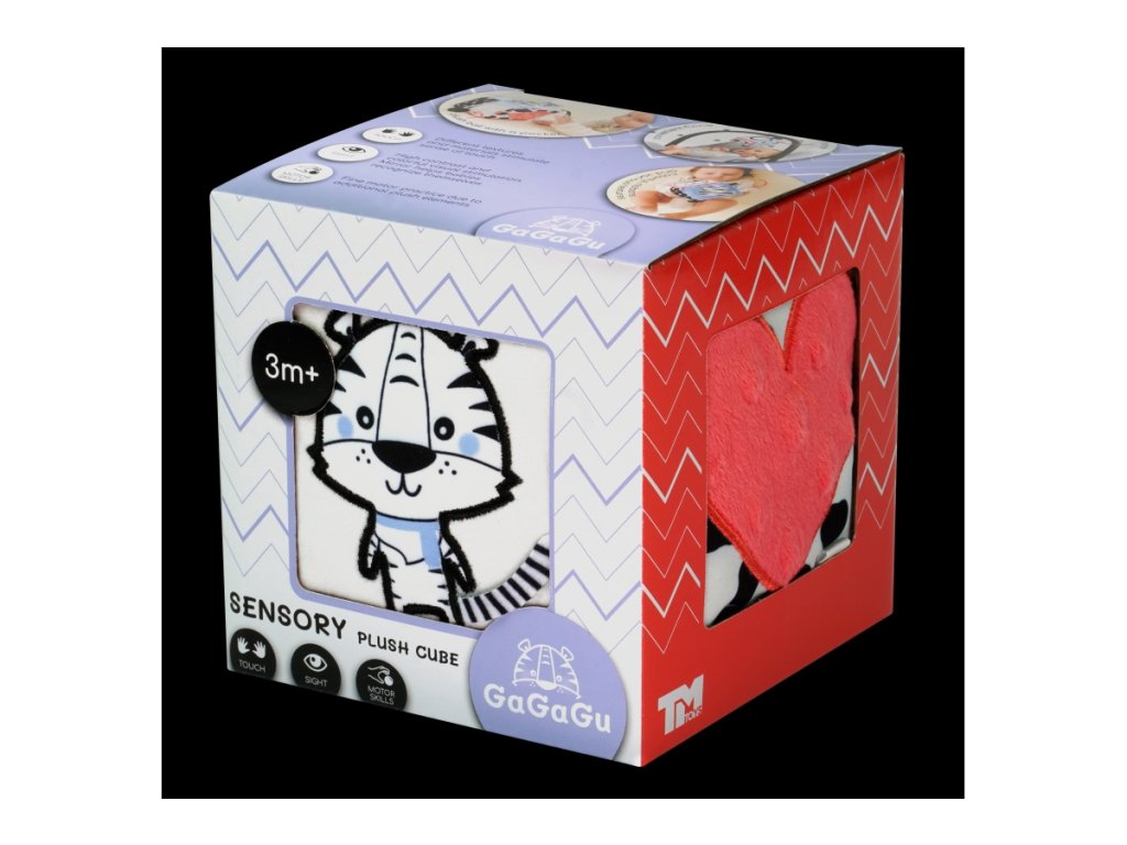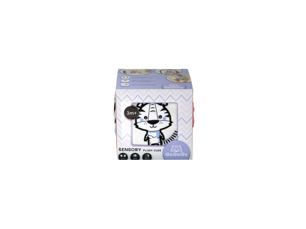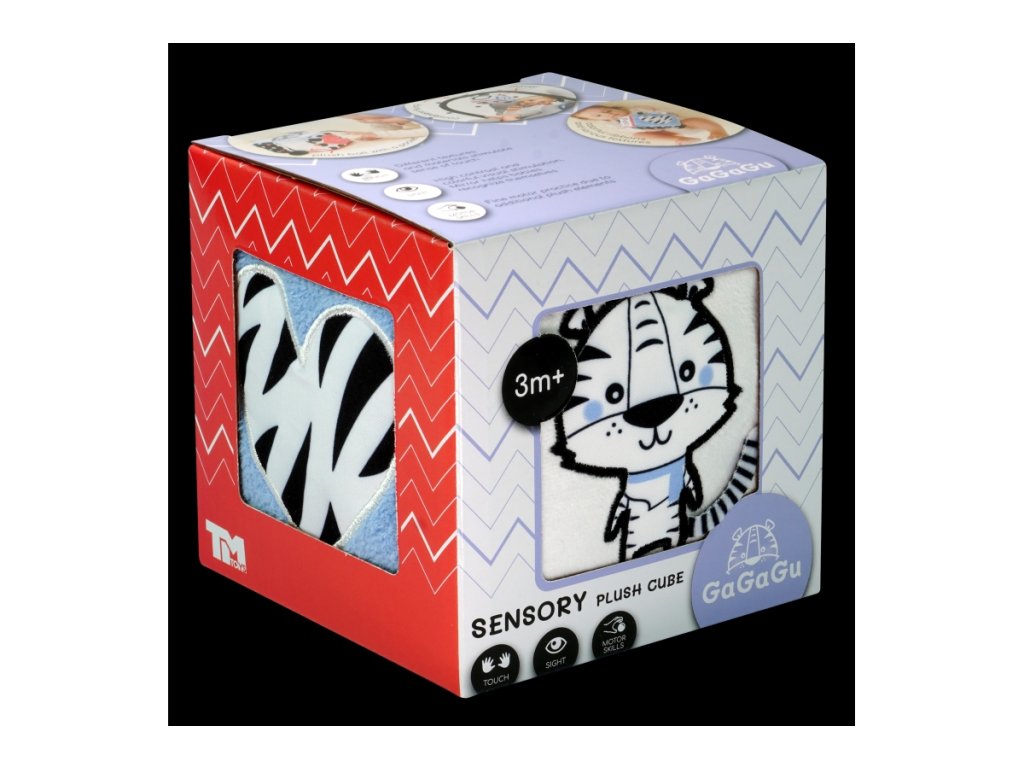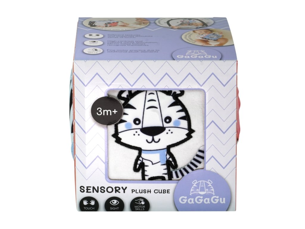 Ať je vaše miminko jakkoli nadané, na hraní s Rubikovou kostkou je ještě příliš brzy. Pro kojence od 3 měsíců doporučujeme spíše plyšovou senzorickou kostku s obrázky přátelské krávy a skotačivého tygra. Kostka GaGaGu má kontrastní barvy a vzory, což stimuluje zrak dítěte. Každá strana kostky je úplně jiná, vyrobena z jiných materiálů (s různými texturami), což dává 6 zcela odlišných smyslových zážitků – vizuálních a hmatových. Dvě strany kostky mají vyčnívající prvky zvířátek – kravské uši, tygří ocas – dítě se učí různé textury materiálů, může uchopit vyčnívající prvky a procvičovat si tak jemnou motoriku. Na další plyšové straně je kapsička s plyšovým míčkem na provázku – prvek vybízí děti k uchopení míčku a jeho vkládání a vyjímání z kapsy – to podporuje tzv. jemné motorické dovednosti a učení motorické koordinace. Na další z plyšových stran je zrcátko, které přitahuje pozornost miminka, vybízí ho, aby kostku uchopil a dozvěděl se o svém odrazu. Z druhé strany jsou našity další stuhy, které zároveň stimulují jemnou motoriku. Věk 3m+Doplňkové parametry
