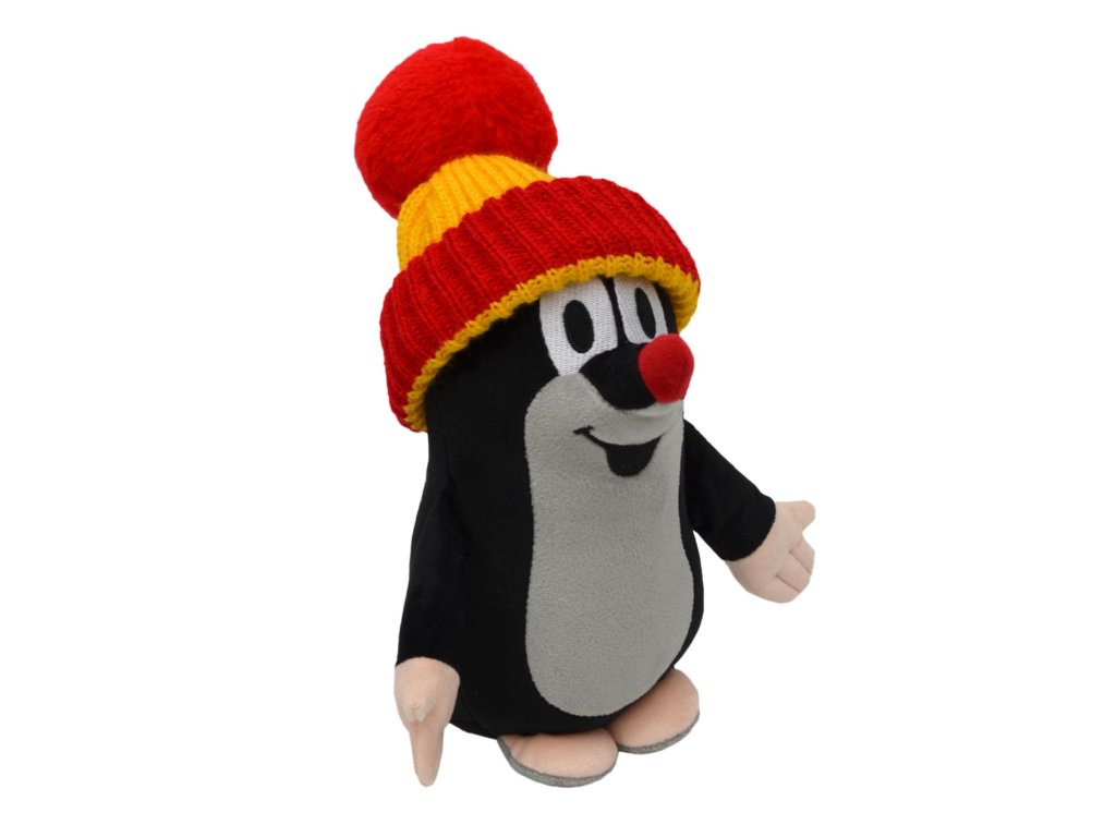 Plyšový Krteček s pletenou sundavací čepicí. Hračka je ve spodní části naplněna "antistresovými fazolkami" pro stabilizaci polohy a rozvoj citu a hmatu dětí.Rozměry balení 23 x 28 x 15 cm.