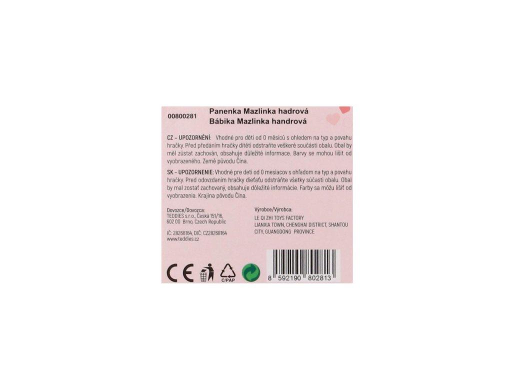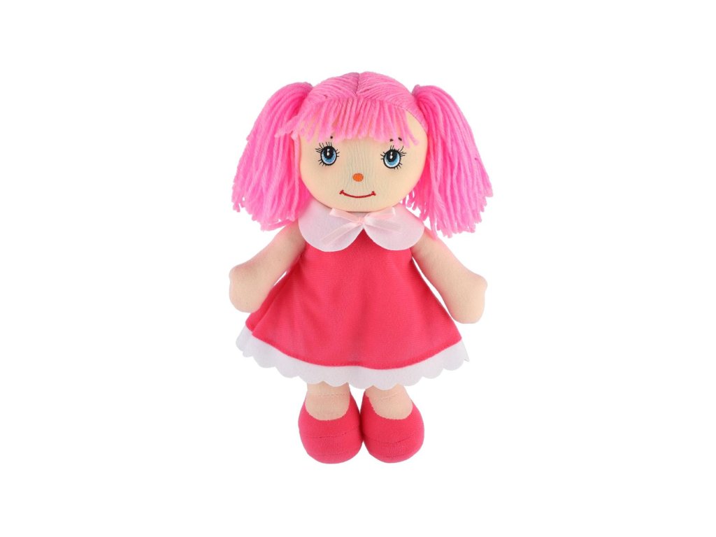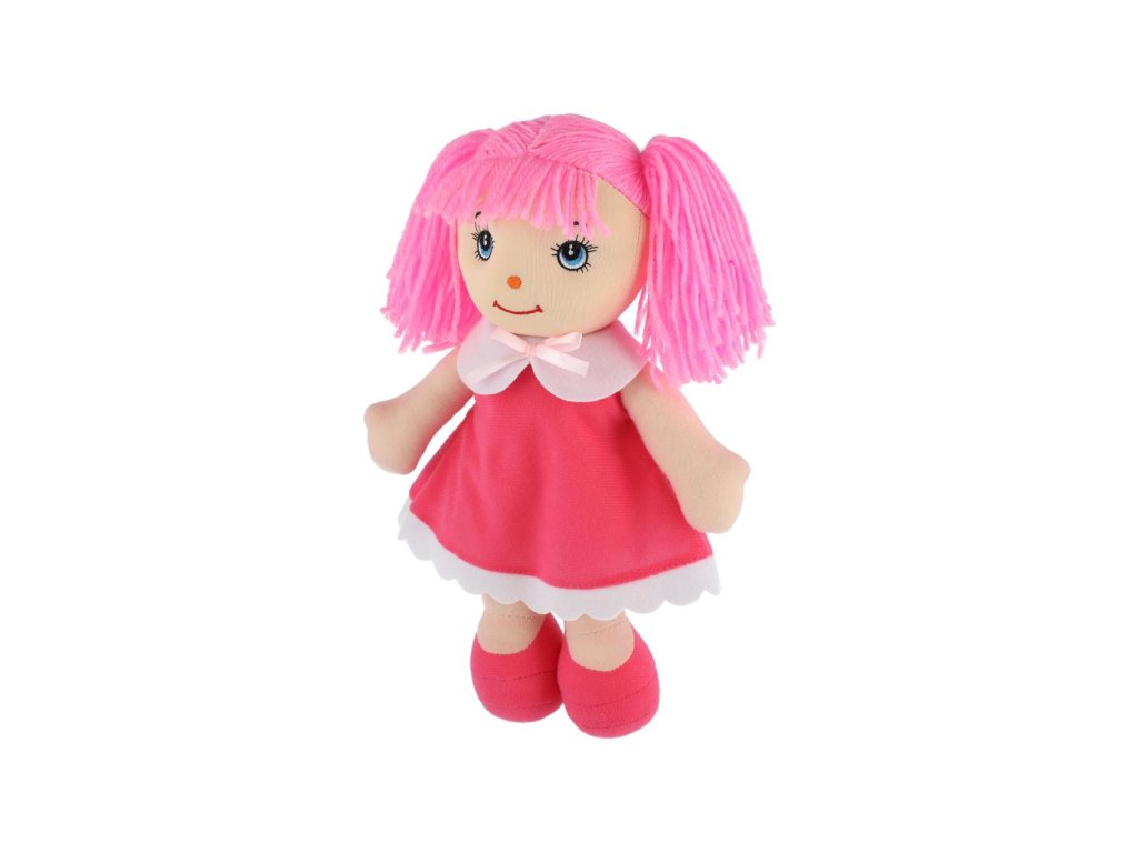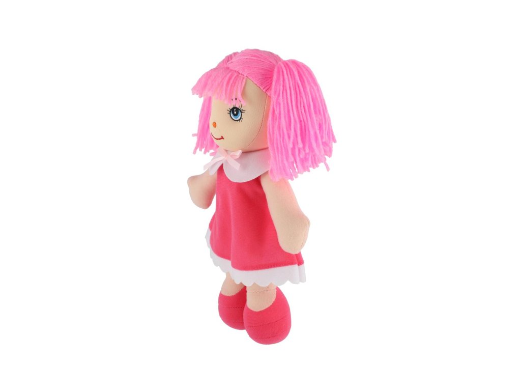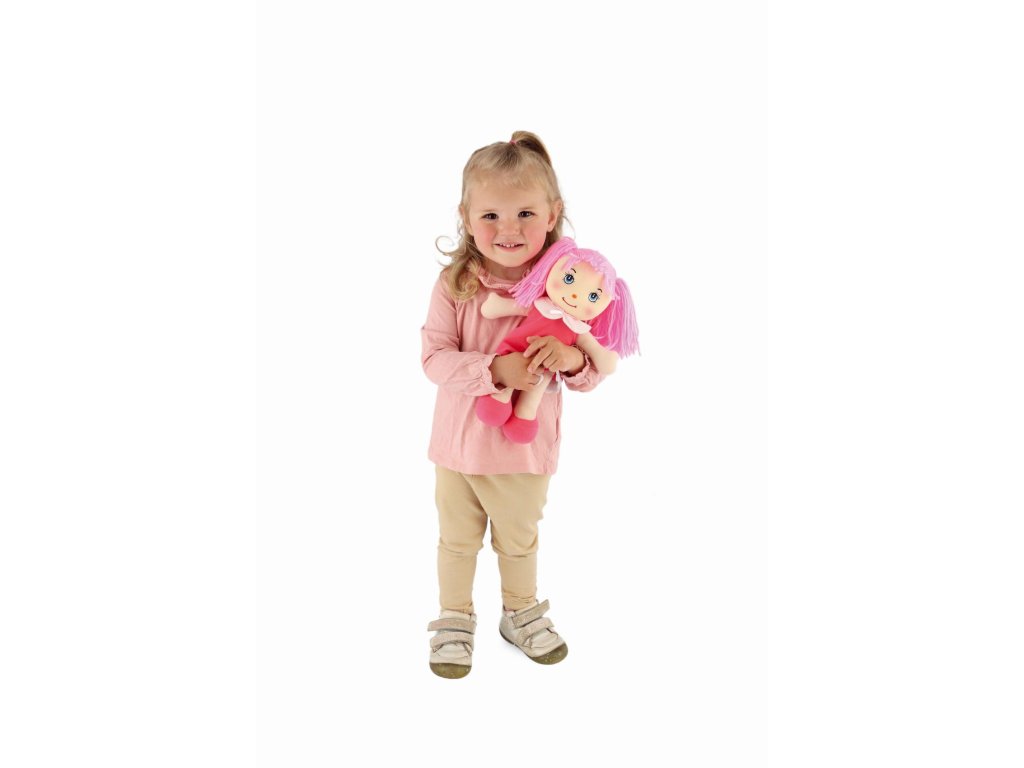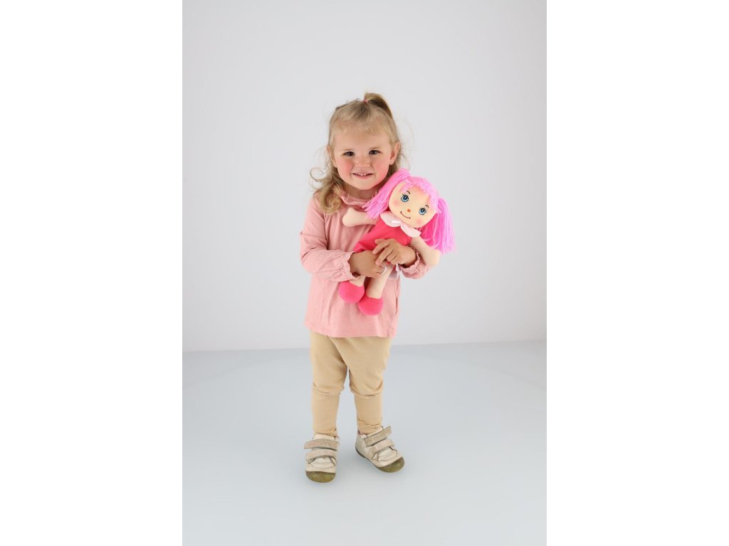 Hadrová panenka s růžovými vlásky v šatičkách má měkké tělíčko. Mazlinka bude nejlepší kamarádka nejen na mazlení, ale i ke hraní. Díky svému příjemnému materiálu a roztomilému vzhledu se stane skvělou kamarádkou pro každodenní dobrodružství i uklidňující usínání.Měří 31 cm