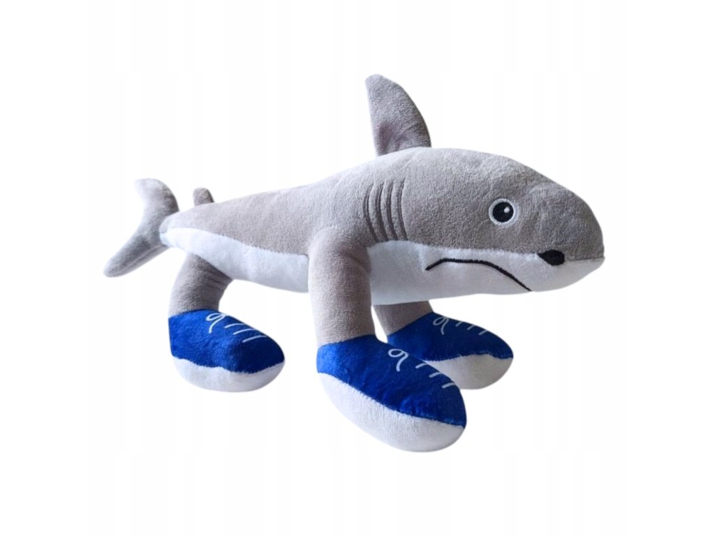 Charakteristickým prvkem jsou tři nohy s modrými botami, které dodávají postavičce roztomile bizarní vzhled. V kombinaci s jednoduchými detaily obličeje a ploutvemi působí hračka jako veselý výtvor dětské fantazie nebo internetové kultury.