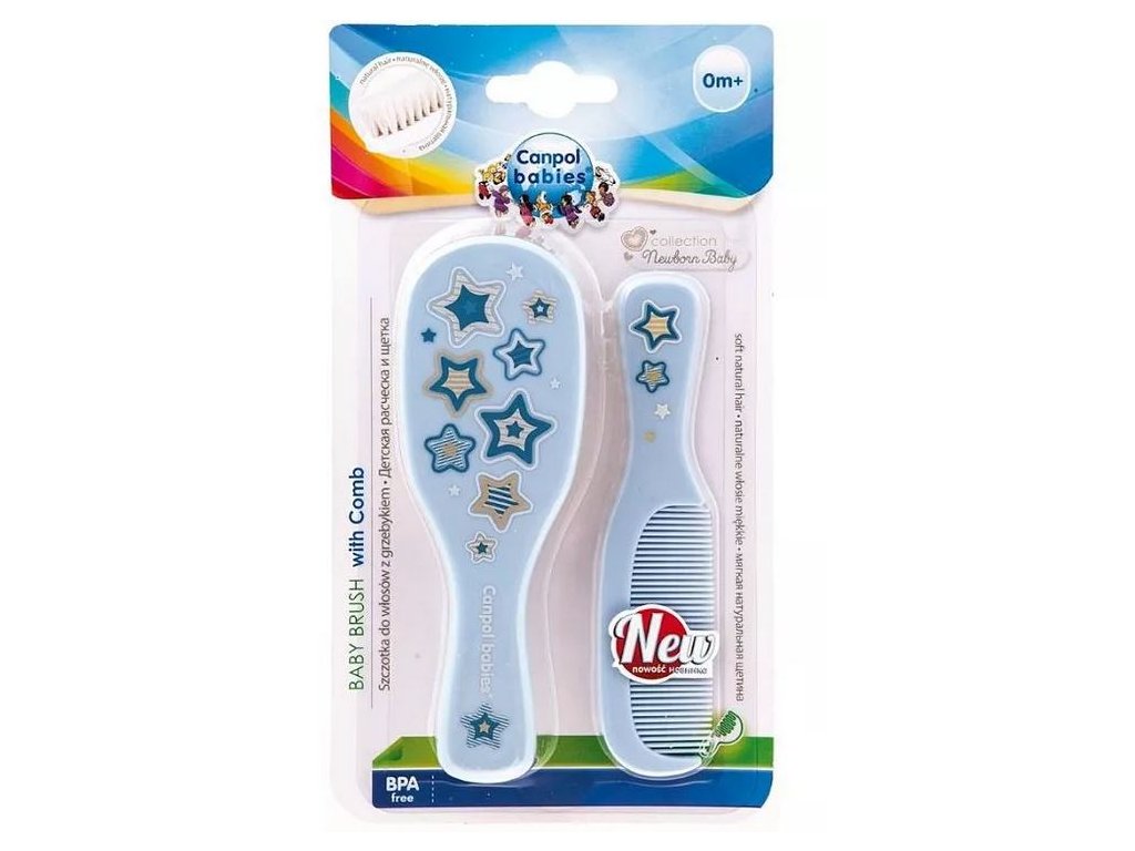 Hřeben s kartáčkem na vlásky Canpol Babies.Sada obsahuje - hřeben se zakulacenými zoubky a kartáč s přírodním vlascem.