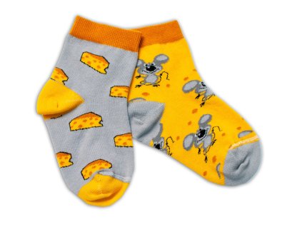 Baby Nellys Bavlněné veselé ponožky Myška a sýr - žlutá/šedá, vel. 122/128