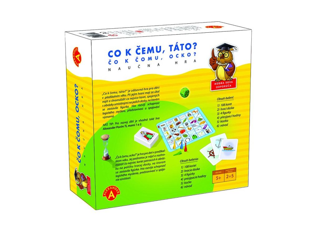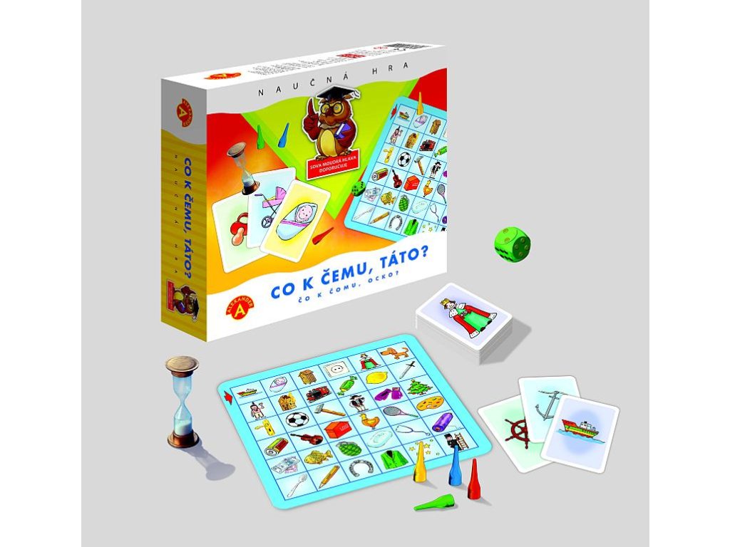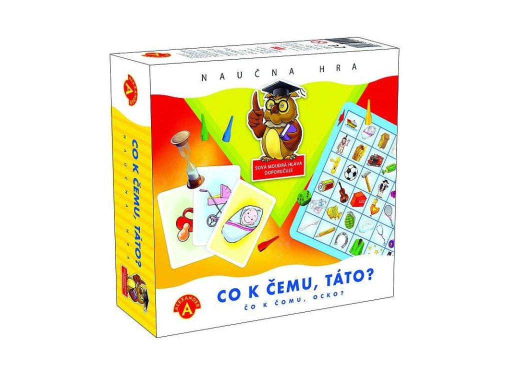 A próóč, tatíí? Hra, která pomůže dětem objasnit souvislosti a uspokojit jejich zvědavost, která je pro ně tak typická. 3 úrovně hry pro různý věk. Pro 2-4 hráče od 4 let. Rozvoj logického myšlení a spojování významů a poznávání, jsou největší benefity této hry pro děti od 4 let. Úkolem je hledat několik souvislostí mezi obrázky na polích hracích desky a obrázky nalezených kartách a správně je pospojovat. Obtížnost hry lze volit podle věku a zkušeností dětí.