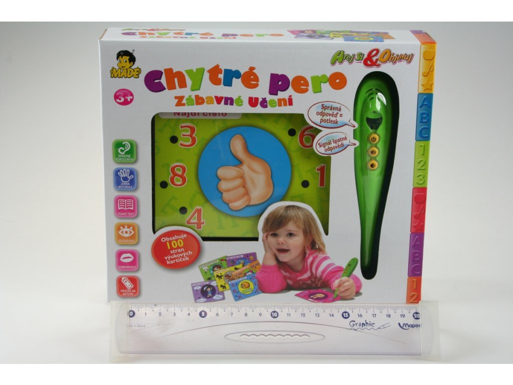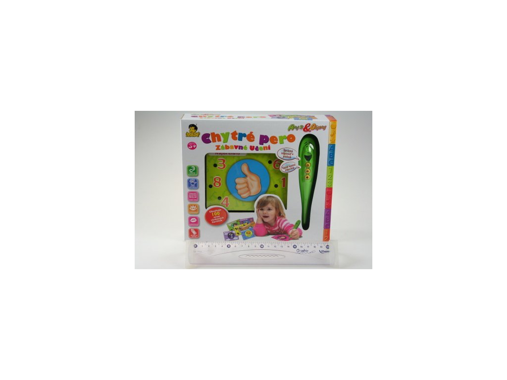 Chytré pero s kartami je interaktivní hra,která děti zaujme a zábavnou formou je mnohému naučí.S chytrým perem je učení snadné a zábavné.Balení obsahuje 100 stran výukových kartiček - najdi číslo,najdi chybějící dílek,které písmeno chybí,kolik je na obrázku hodin,?Pero vydává zvukové efekty,světelná signalizace správné či špatné odpovědi,nastavení úrovně hlasitosti.Provoz na 2 baterie AAA.Věk 3+Doplňkové parametry