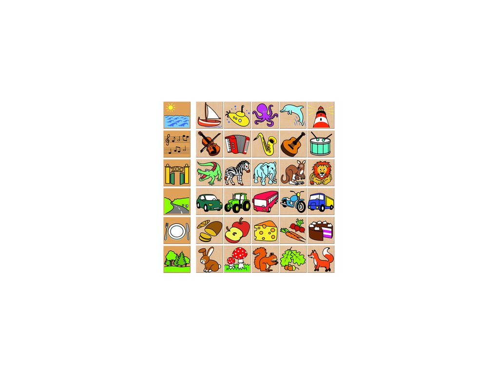Didaktická hra z dřevěných kamenů. Hra pomáhá dětem rozpoznávat předměty a přiřazovat je ke správnému obrázku.