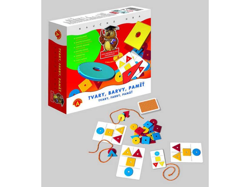 Zábavná naučná hra. Učí barvy a tvary, rozvíjí paměť, postřeh a koncentraci. Pro 2-4 hráče od 5 let. Na 55 kartách najdete vzory tvořené obrázce, které odpovídají tvarům plastových žetonů. Po chvilkovém prohlédnutí karty je třeba z žetonů složit zapamatovaný vzor. Ve druhé verzi hry musí její účastníci co nejrychleji navléct žetony na provázek. Jejich barva, tvar a počet se musí shodovat s kartou, kterou si hráč na krátkou chvilku prohlédl. Nečekaně zábavná hra, která učí barvy a tvary, rozvíjí paměť, postřeh a koncentraci. Skládej žetony různách tvarů a barev podle vzorové karty. Zapoj postřeh a paměť. Zaleží na každém detalu a rychlosti abys zvítězil! Při hře se s dětmi skvěle zabaví i celá rodina. - zábavné učení barev a tvarů - trénink soustředění, postřehu a paměti - 2 různé varianty hry