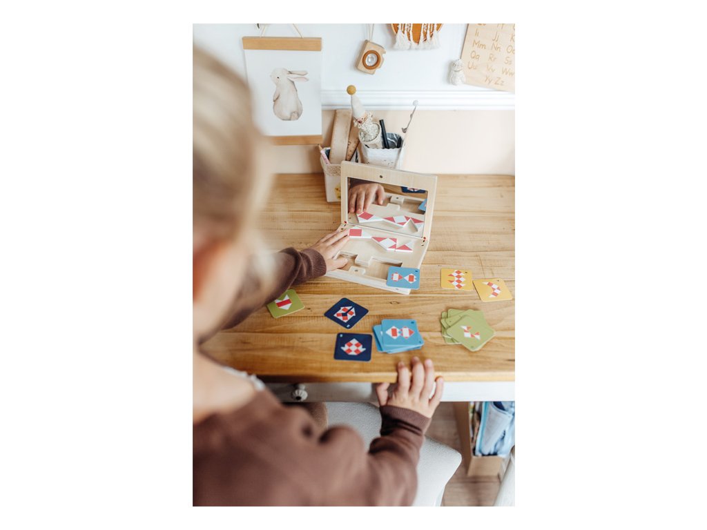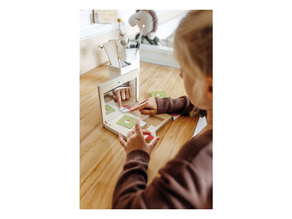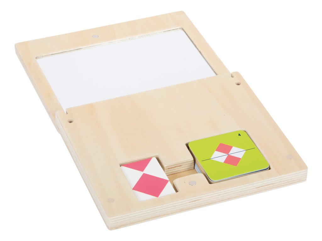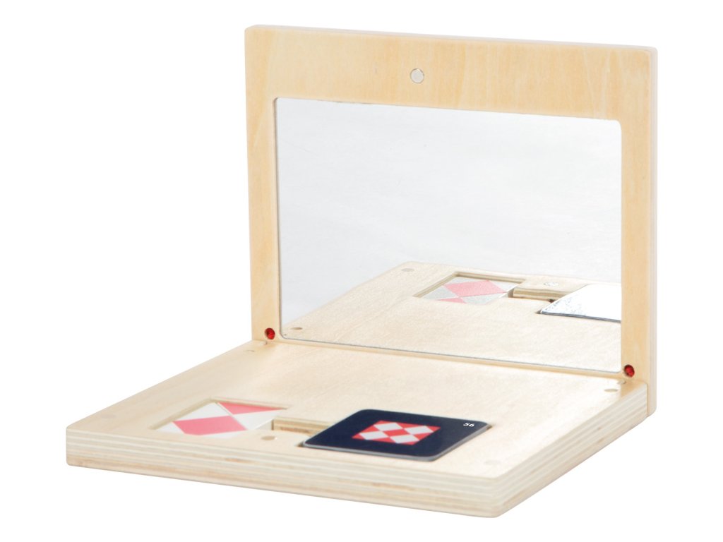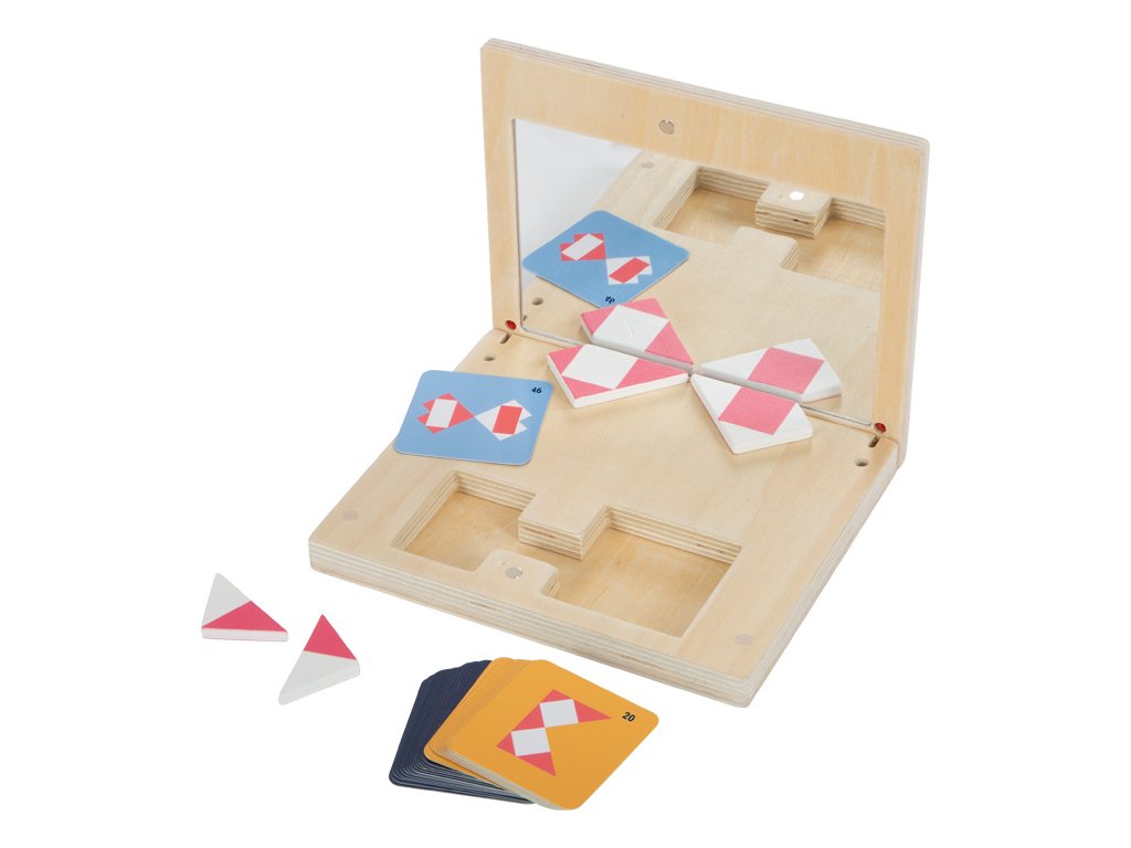 Objevte zrcadlové obrazy a symetrie hrou. Tato skvělá hra v praktické dřevěné krabičce je určena k intenzivnímu zkoumání symetrických obrazců a geometrických tvarů. Cílem dětského zrcadlového tangramu je umístit čtyři tvarové destičky z pevného dřeva před velké nerozbitné zrcadlo tak, aby umístěný obrazec spolu s obrazcem v zrcadle tvořil obrázek na příslušné kartě předlohy. Na 32 oboustranně potištěných šablonových kartách najdete úkoly se zvyšující se obtížností. Díky praktickému magnetickému uzávěru a kompaktním rozměrům je hra také ideálním společníkem a zábavou na cestách. Geometrické zrcadlo je fascinující hra a výuková zábava pro trénink prostorové a geometrické představivosti. Je vhodná také pro rozpoznávání vzorů, tvarů, obrazců a jejich zrcadlových obrazů a symetrií. Vzdělávací hra, která zároveň hravou formou podporuje soustředění. Díky odolnému materiálu má hra na symetrii dlouhou životnost a lze ji používat několik let. Ideálně se doplňuje s dalšími vzdělávacími hrami z produktové řady "Educate". Hlavní vlastnosti: lze doplnit dalšími vzdělávacími hrami z produktové řady "Educate"baleno v praktické krabičce s magnetickým uzávěremhra vhodná k učení symetrických obrazců a geometrických tvarů32ks s oboustranně potištěnými kartamirůzně obtížné úlohy o symetriipodporuje soustředěníDoplňkové parametry