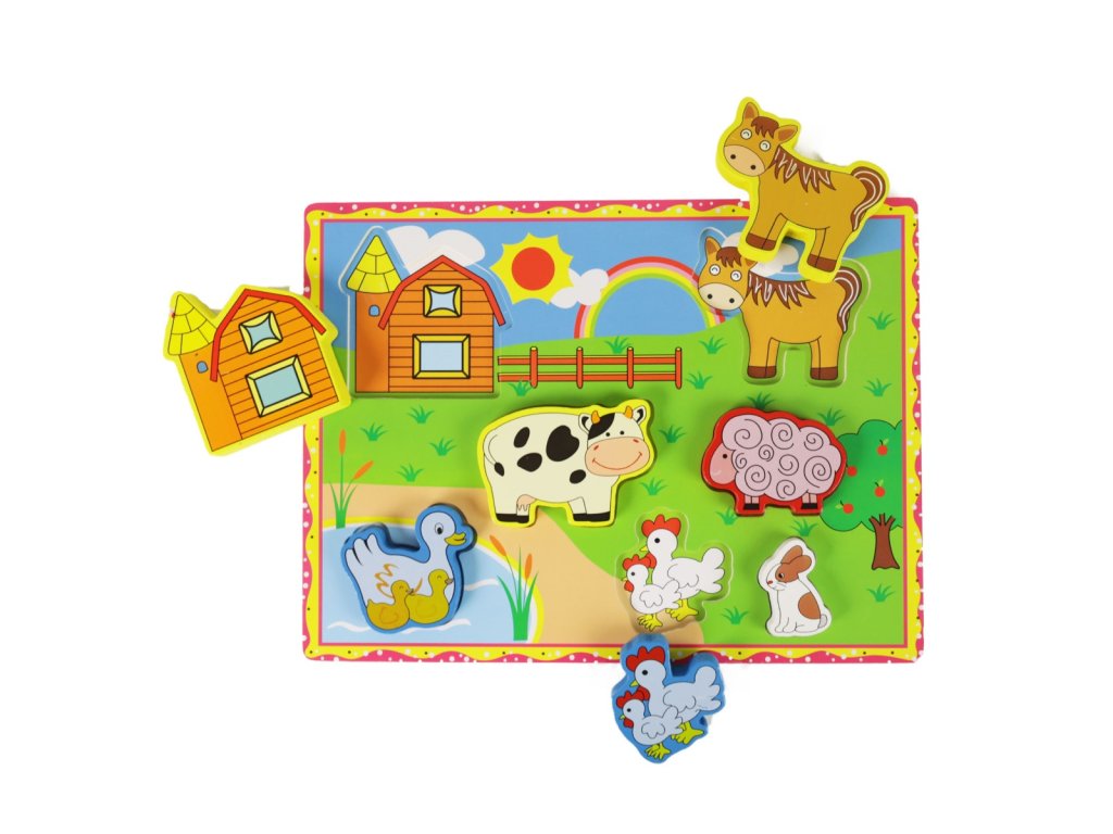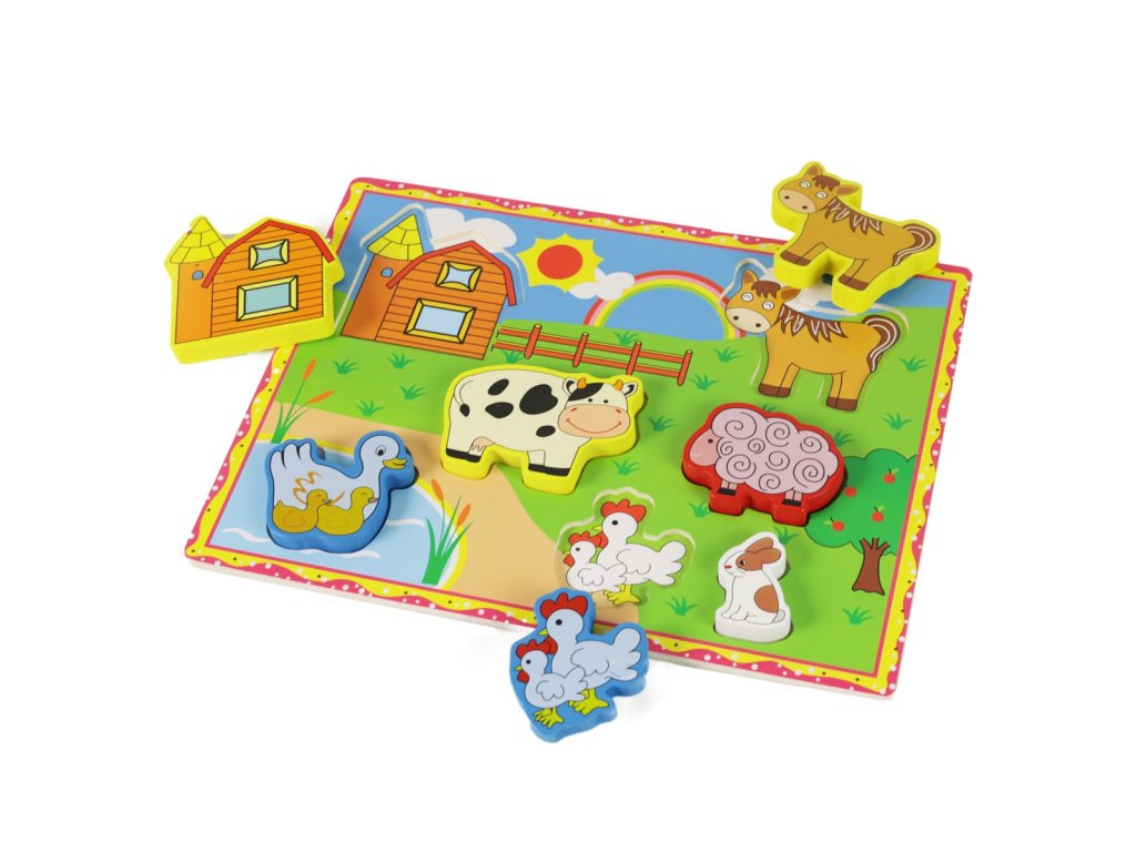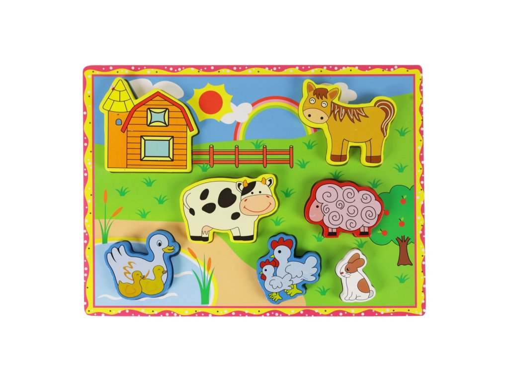 Dřevěná 3D vkládačka s motivy domácích zvířátek.Obsahuje 7 zvířátek a základní tématicky potištěnou deskou. Zvířátka neobsahují úchyt, ale dítě jednotlivé tvary zvířátek vytáhne rukou. Zvířátka z vkládačky vystupují. Baleno ve fólii.