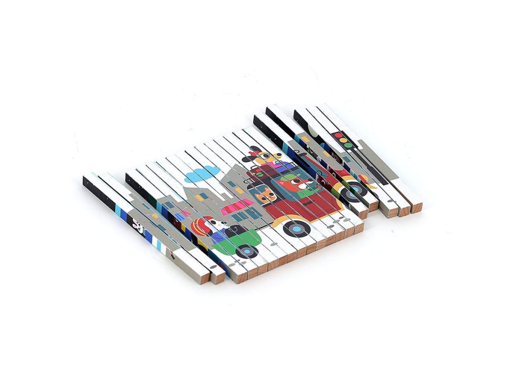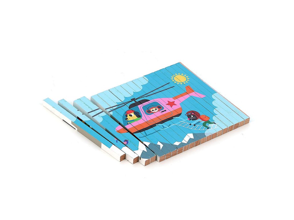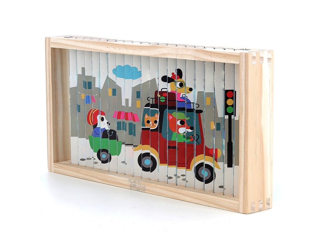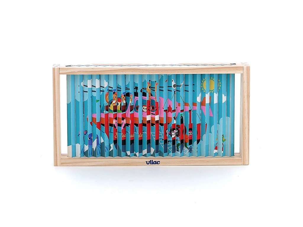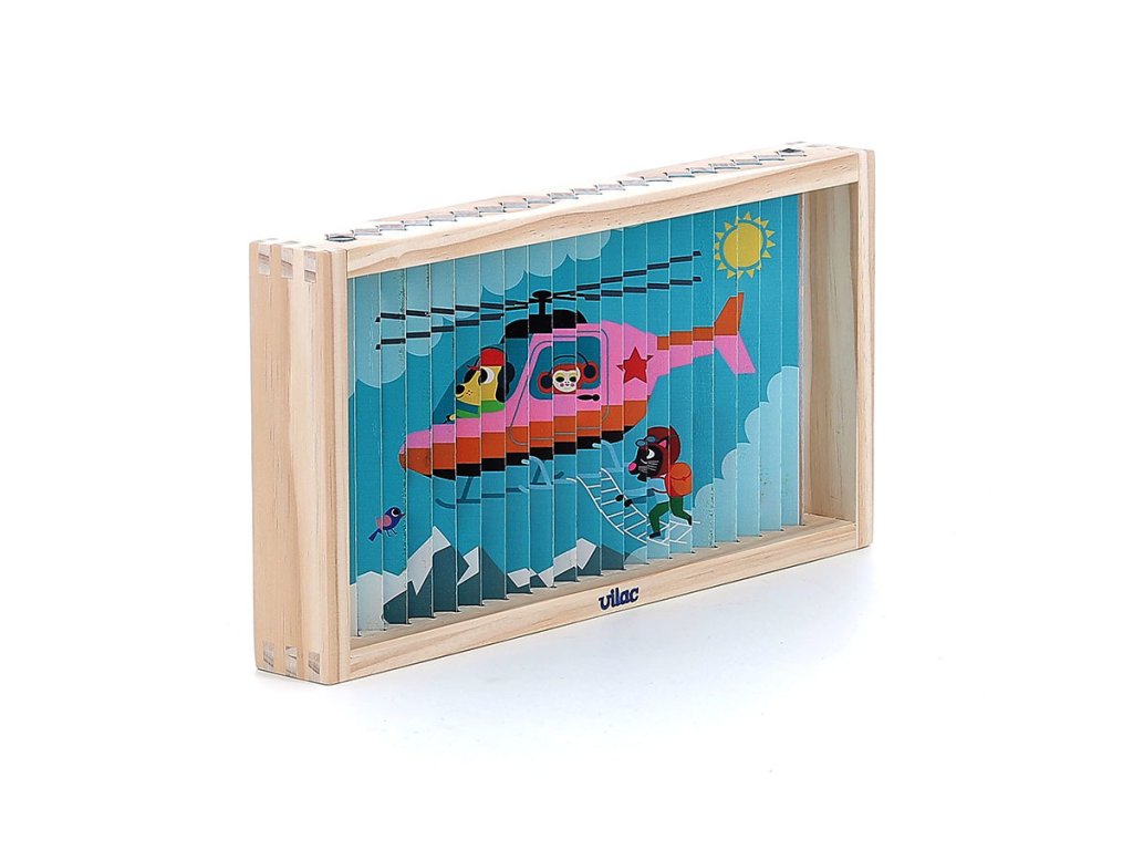Nakloním se doleva a vidím auto. Nakloním se doprava a objeví se vrtulník. Celkem čtyři různé ilustrace se ukrývají v jedné chytré skládačce – auto, loď, vrtulník a vlak. Čtyřrozměrná dřevěná skládačka, nádherně ilustrovaná Ingelou P. Arrhenius, je ideální hračkou pro rozvoj logického myšlení a pozorovacích schopností dětí. Pomocí malých dřevěných tyčinek, které se zasouvají do rámečku, dítě objevuje čtyři různé obrázky podle úhlu pohledu. Tento inovativní přístup povzbuzuje dítě k pozornému sledování detailů a k pochopení toho, jak se jednotlivé části spojují do celkového obrazu. Manipulace s tyčinkami podporuje soustředění, logické uvažování a přispívá k rozvoji kognitivních schopností, a to vše formou zábavy. Skládačka je zároveň výborným prostředkem pro trénink jemné motoriky. Při zasouvání dřevěných tyčinek do podložky se dítě učí přesnému ovládání pohybů a rozvíjí koordinaci ruka-oko. Každý pohyb vyžaduje soustředění a přesnost, což posiluje drobné svaly na prstech a rukou, dovednost, která je důležitá například pro psaní. Skládačka tak nabízí zábavnou aktivitu, která podporuje i fyzický rozvoj dítěte. Díky originálním ilustracím Ingely P. Arrhenius je tato čtyřrozměrná skládačka skvělým nástrojem pro podporu dětské fantazie. Objevováním obrázků z různých úhlů se dítě učí vnímat svět z nových perspektiv a má příležitost vymýšlet vlastní příběhy. Tato vzdělávací hra rozvíjí nejen logické myšlení, ale i slovní zásobu a kreativitu. Jde o komplexní hračku, která spojuje přemýšlení, motoriku i představivost, ideální pro společné chvíle s rodinou.