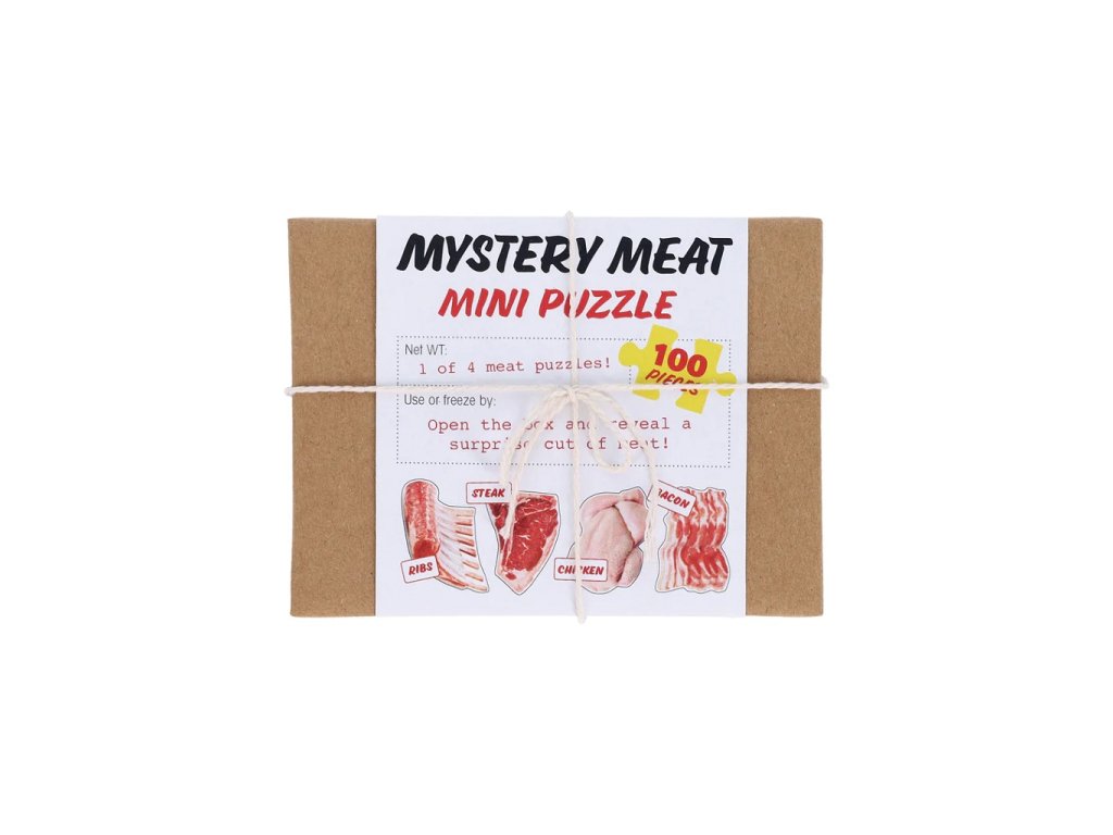 Krabička s překvapením. Ideální pro fanoušky originality. Speciální mini puzzle v rustikálním balení. Puzzle, kde se obrázek odhalí, až po jeho složení. Otevřete záhadnou krabičku a objevte svůj kus masa. Možnosti jsou čtyři. Žebra, steak, kuře či slanina. Které z puzzlí bude právě ve Vaší krabičce? Vyrobeno z recyklovaných materiálů a z papíru s certifikací FSC. Potištěno netoxickými inkousty.