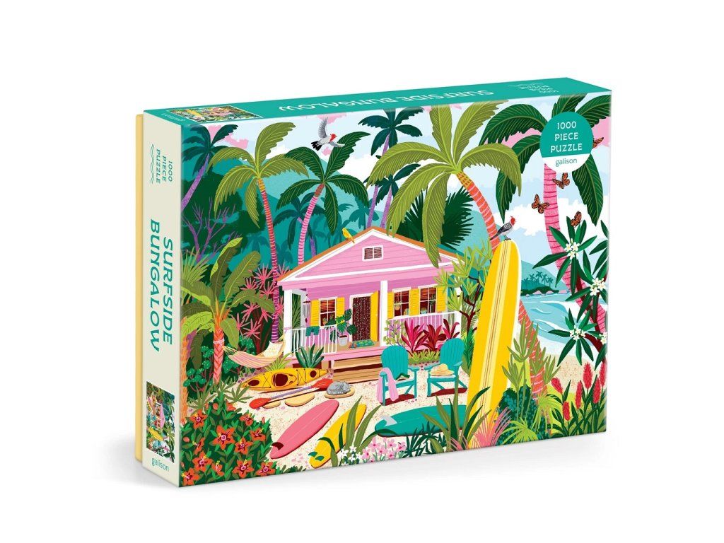 Unikněte do tropického ráje s puzzle Surfařský bungalov od značky Galison, vytvořeného podle ilustrace umělkyně Julie Cornelius.
