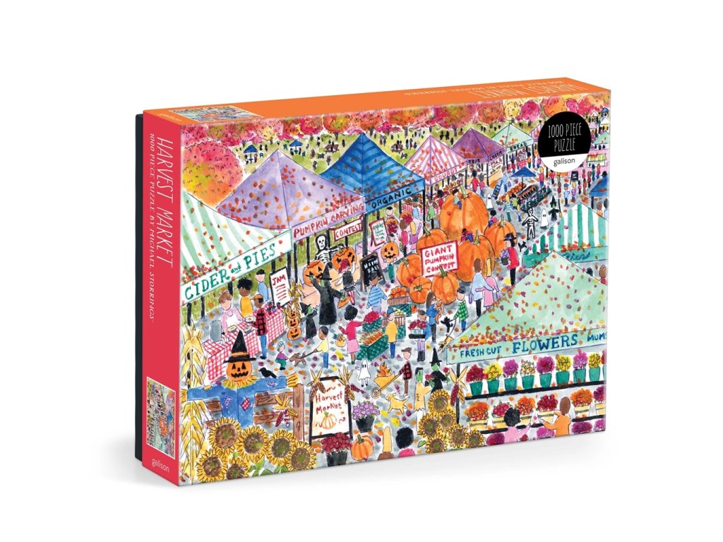 Ponořte se do hřejivé atmosféry s puzzle Trh podzimní úrody, které vzniklo podle krásné ilustrace Michaela Storringse. Obrázek zachycuje útulné podzimní tržiště plné barevných dekorací, dýní, světýlek a drobných halloweenských detailů, díky kterým má celé puzzle příjemnou a lehce magickou náladu.