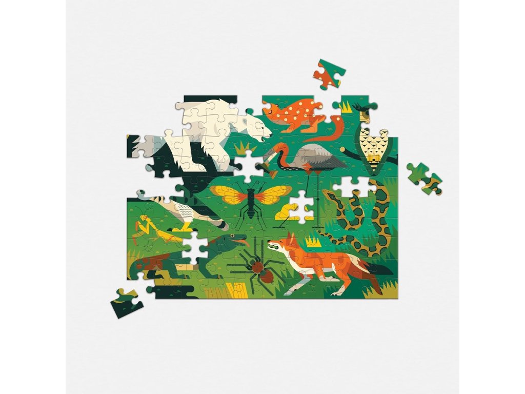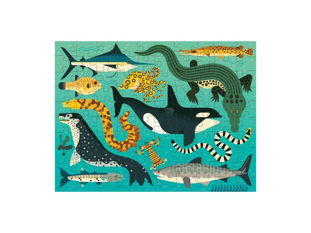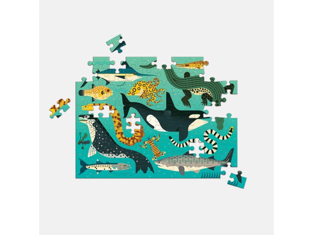 Oboustranné puzzle zobrazuje barevné lovce divočiny na jedné straně a odvážné lovce hlubin oceánu na straně druhé. Toto puzzle dva v jednom je skvělou rodinnou aktivitou, kterou si mohou společně užít dospělí i děti.