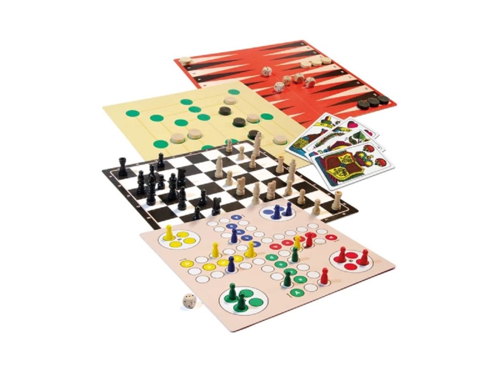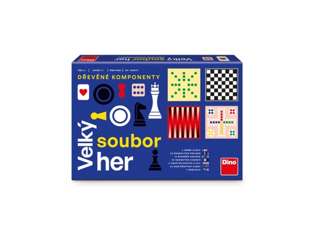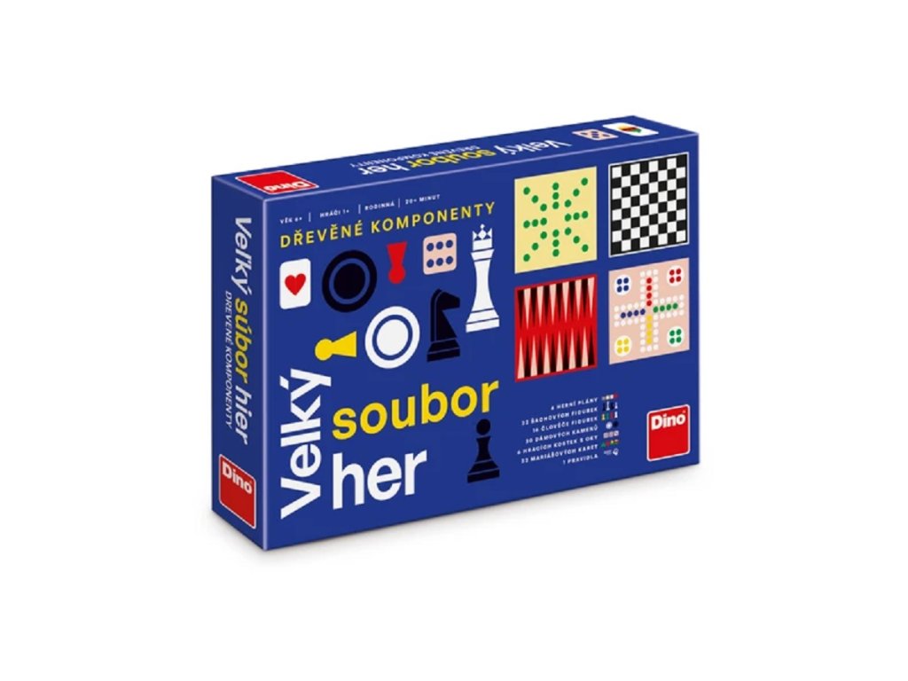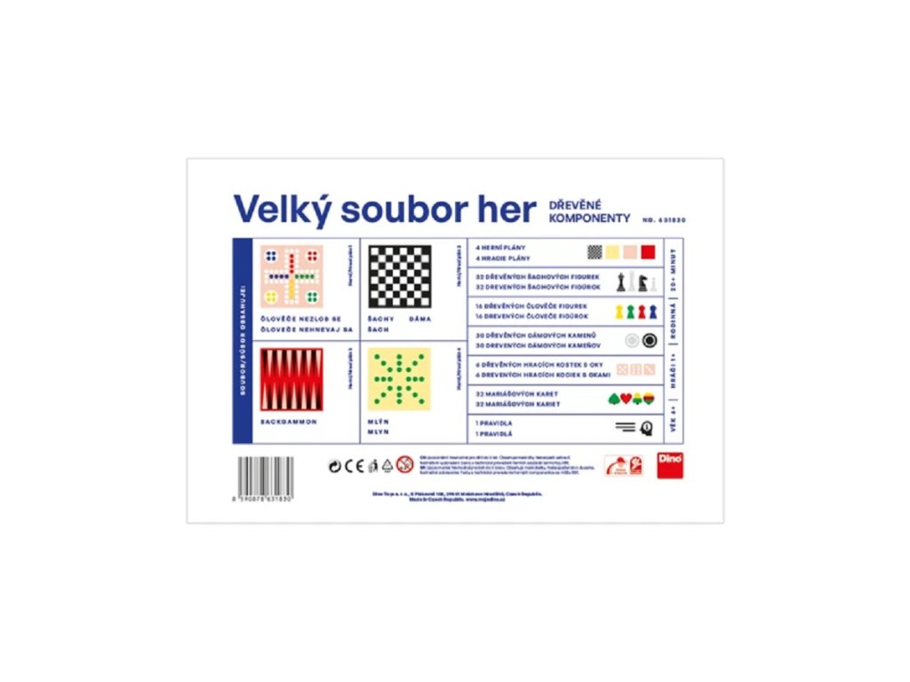 Velký soubor her s dřevěnými komponenty je kolekce 150 klasických společenských her, které zahrnují jak známé, tak i netradiční varianty. Tento rozsáhlý soubor klasických her by neměl chybět v žádné rodině. Mezi obsaženými hrami v tomto souboru 150 herních variant patří šachy, dáma, mlýn, halma, samotář, Člověče, nezlob se!, backgammon (vrchcáby), hry s kostkami, mariášové karty a kvarteto. Herní desky jsou vyrobeny z pevného kartonu, zatímco figurky a hrací kameny jsou dřevěné. Pokud se rozhodnete zahrát si každou hru jen jednou, máte před sebou více než 100 hodin skvělé zábavy. Hry trénují logické a strategické myšlení a se souborem si dobře vyhrají děti již od 6 let. Balení obsahuje: 2 oboustranné herní plány32 dřevěných šachových figurek30 dřevěných kamenů pro hru dáma16 dřevěných člověče figurek32 mariášových karet6 dřevěných bodových kostek1 pravidla Hlavní vlastnosti: hra zaručí nejen zábavu, ale i napínavé zážitkyprocvičí paměť, postřeh, trpělivost i logické myšlenírozvíjí kreativitu a vyjadřovací schopnostivyrobeno v ČRDoplňkové parametry