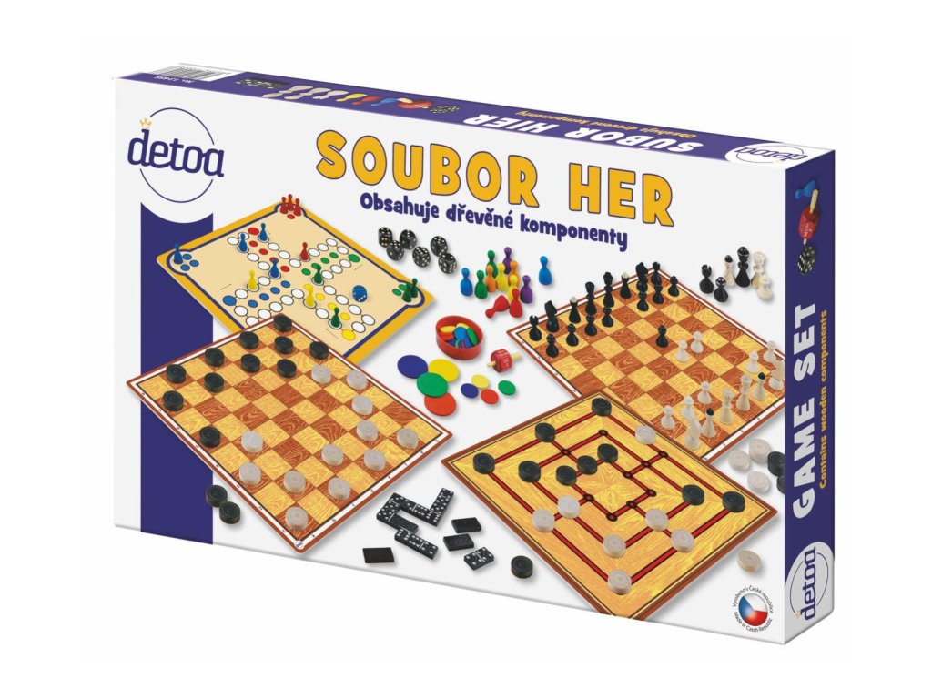 Výběr oblíbených společenských her v jednom balení. Zábava pro každou věkovou skupinu. Vyberte si podle nálady kterou hrou pokoříte svého soupeře. Velké množství herních možností Vám pomůže zahnat nudu, kdykoliv si vzpomenete. Soubor her obsahuje Člověče, nezlob se, domino, kostky, šachy, dámu, bleší hru a mlýn. Součástí jsou dřevěné komponenty a hrací desky z tvrdého papíru, v krabici.Rozměr krabice: 37 x 22 x 4 cm.