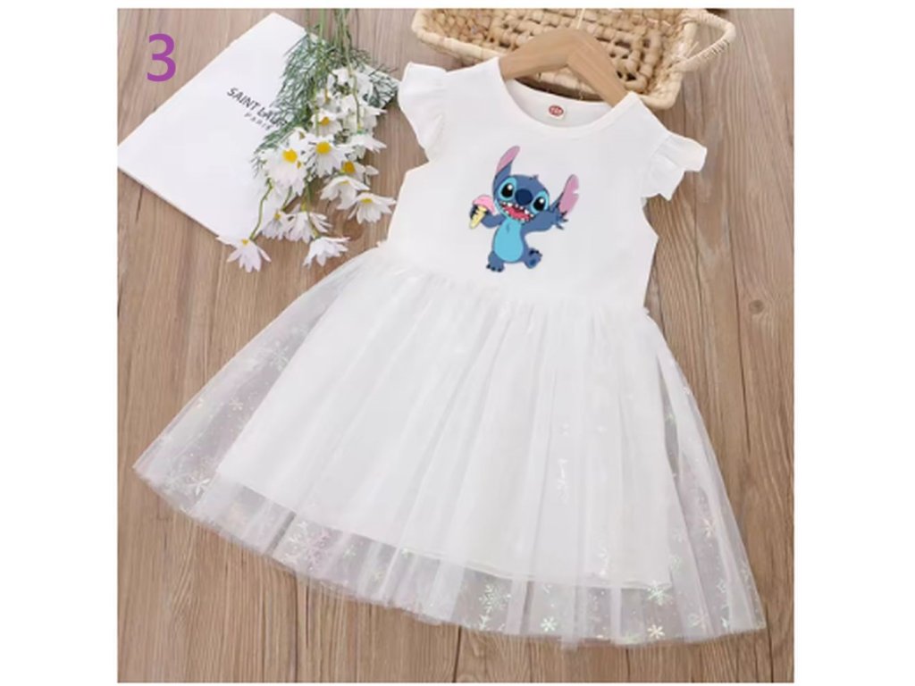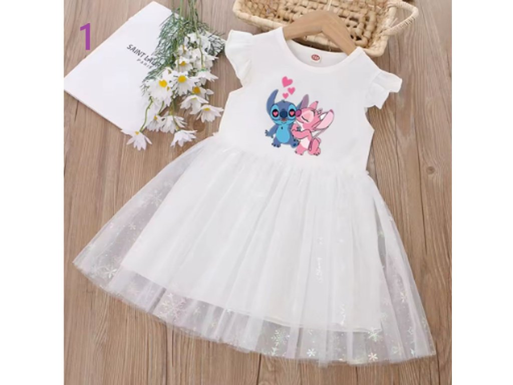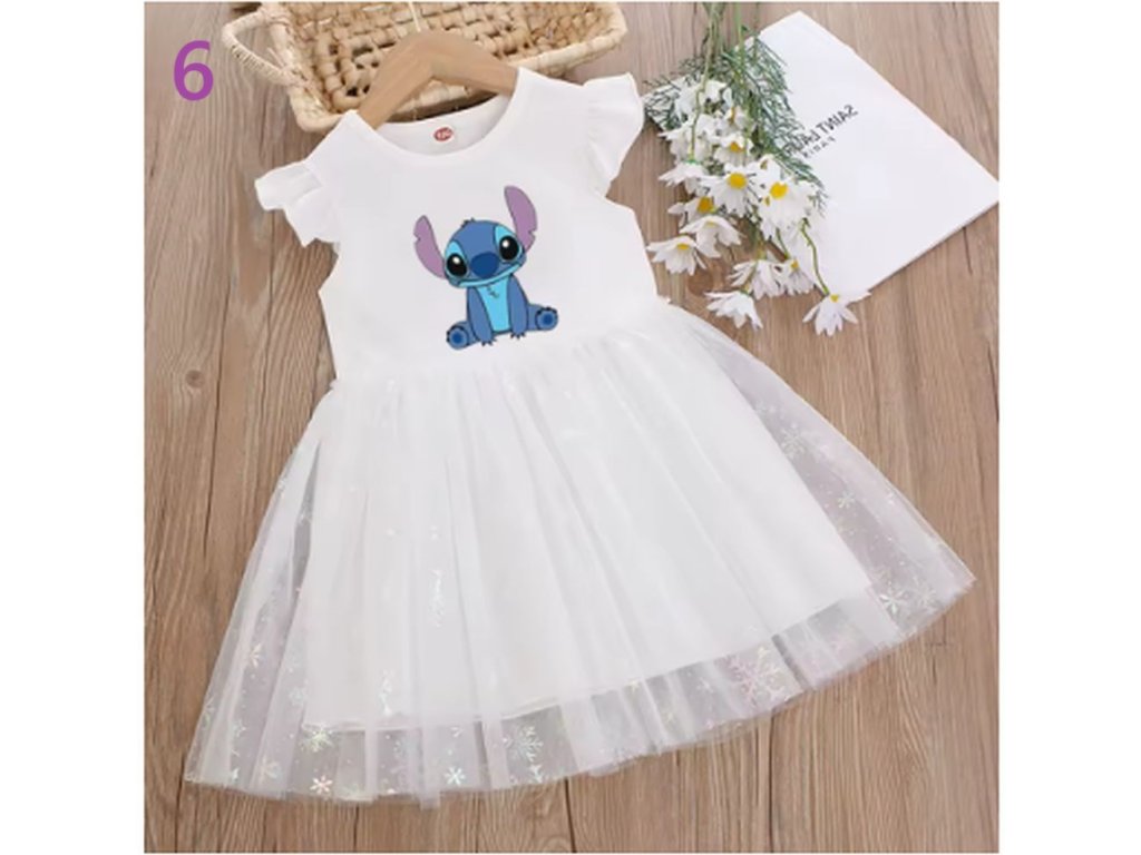 Roztomilé bílé šaty pro malé princezny s potiskem oblíbené postavičky Stitch. Horní část je z příjemné bavlny s volánkovými rukávky, sukně je z lehkého tylu s třpytivými hvězdičkami. Šaty jsou ideální na běžné nošení, oslavy i focení. V nabídce máme stejné šatičky i v modré, růžové nebo fialové barvě.