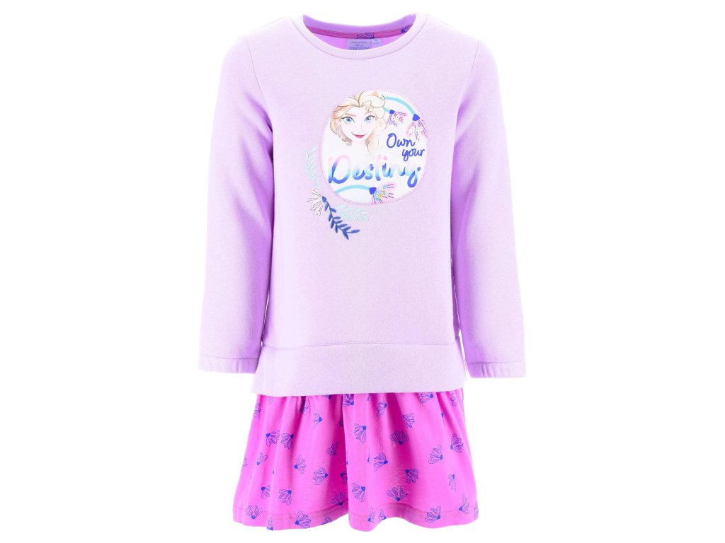 Šaty - mikina a sukně v jednom s motivem Frozen. Materiál: 57% bavlna, 43% polyester. Barva: fialová. Výrobce: Sun City.